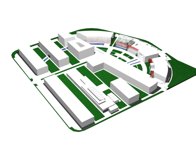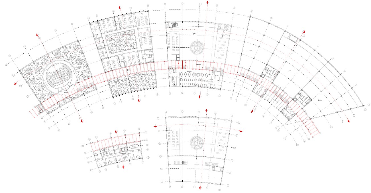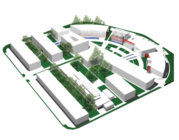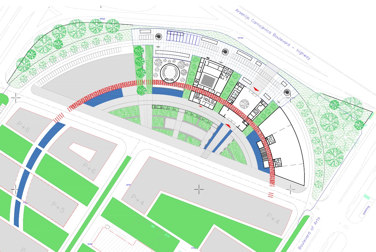 The topic was the urban design of the block and the Center for the Promotion of Science itself. The block is organized so that the orthogonal orientation of the buildings follows the street pattern. The Center itself, located in the northwest of the block, was designed as an arch form consisting of several segments connected by an accented passage. The segments of the center are separated functionally, so that in one there is a planetarium, in another there are classrooms and offices, in the third there is a canteen and in the fourth there are halls intended for various events within the Center. The red footbridge that connects them is designed as a steel structure covered with glass. It initiates some parts of the Center and penetrates through others, forming a dynamic whole.
