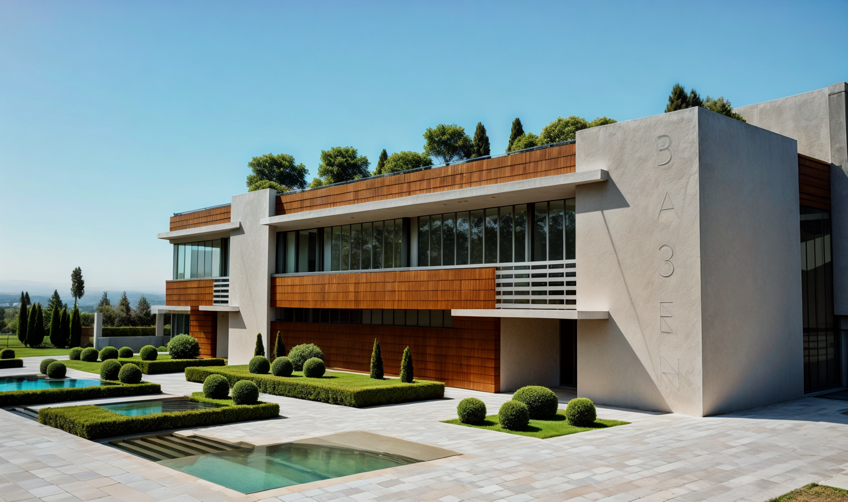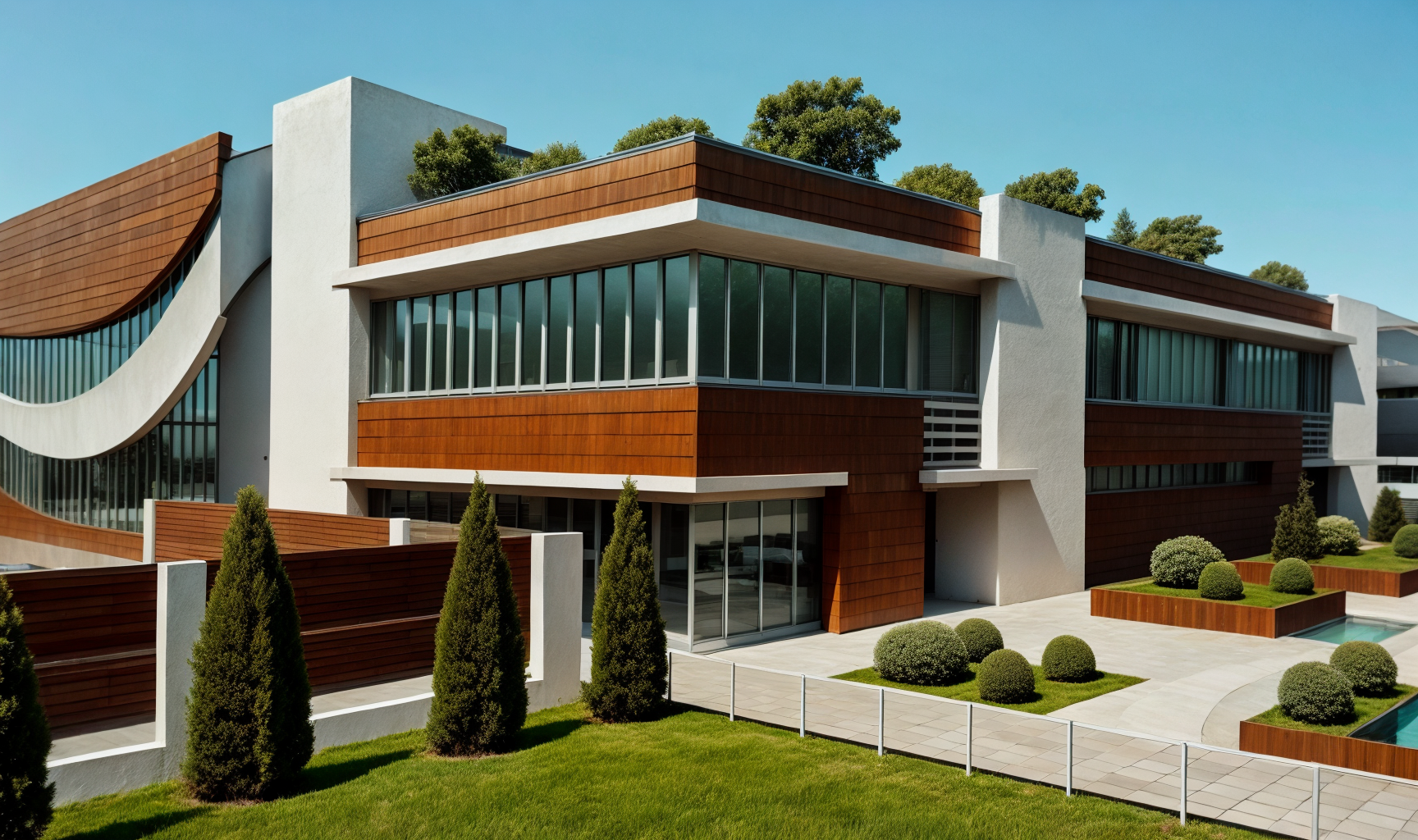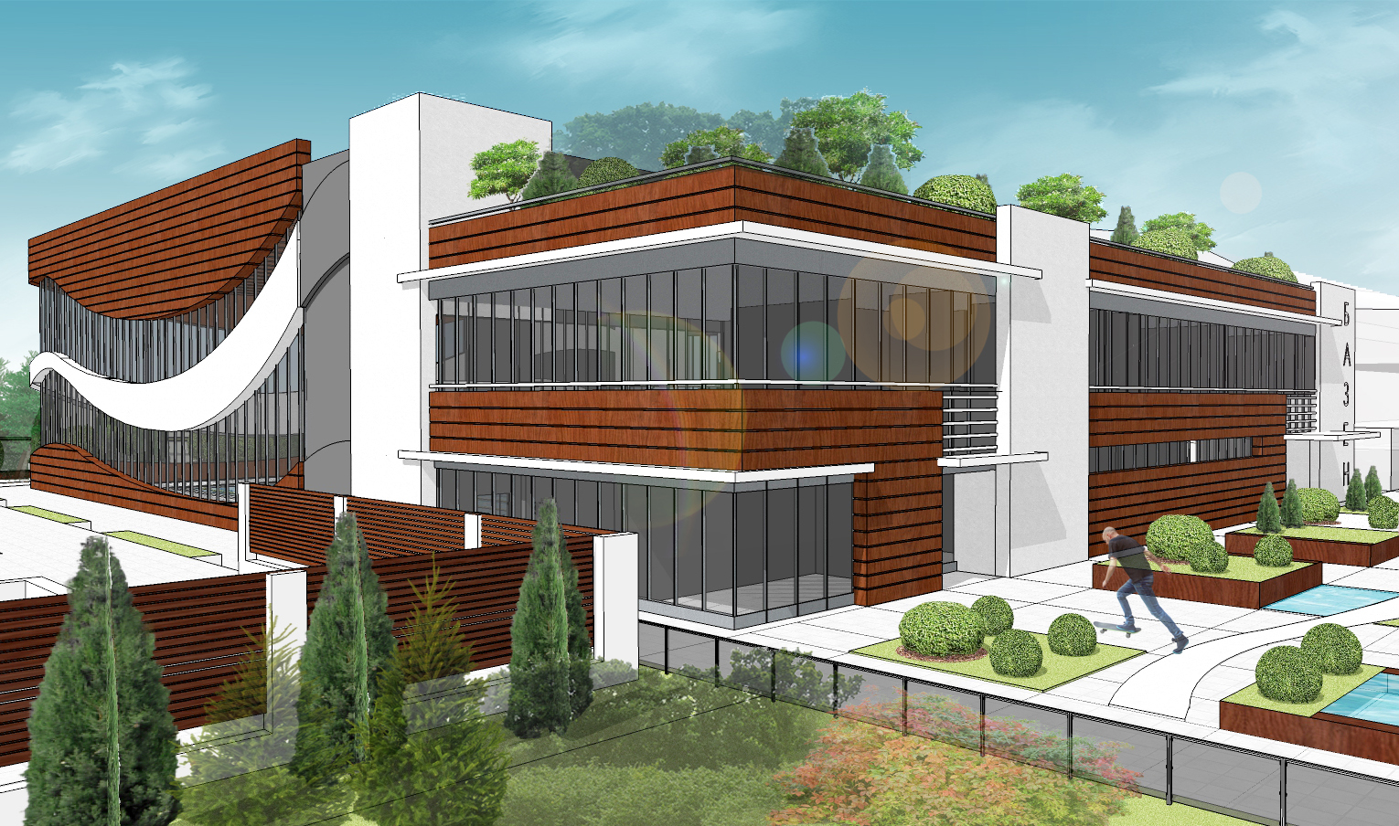 The street facade is designed in a strict geometric rhythm with plans that are emphasized by facade panels in wood decor. The ground floor arrangement in front of the building followed the divisions on the facade, and they are also reflected in the paving and green areas, as a reflection.