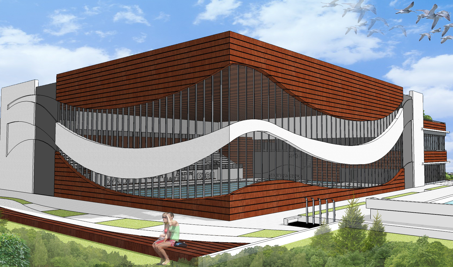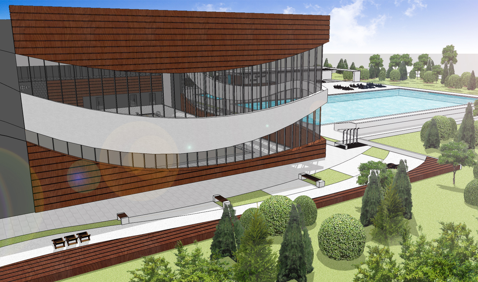 The side facade and part of the rear facade are mostly glazed, but the form in this area is playful, symbolizing the shape of a wave. The wave is symbolic, but this symbolism is additionally emphasized by the fact that it is positioned on the facade, which is the border between the open and closed pool.