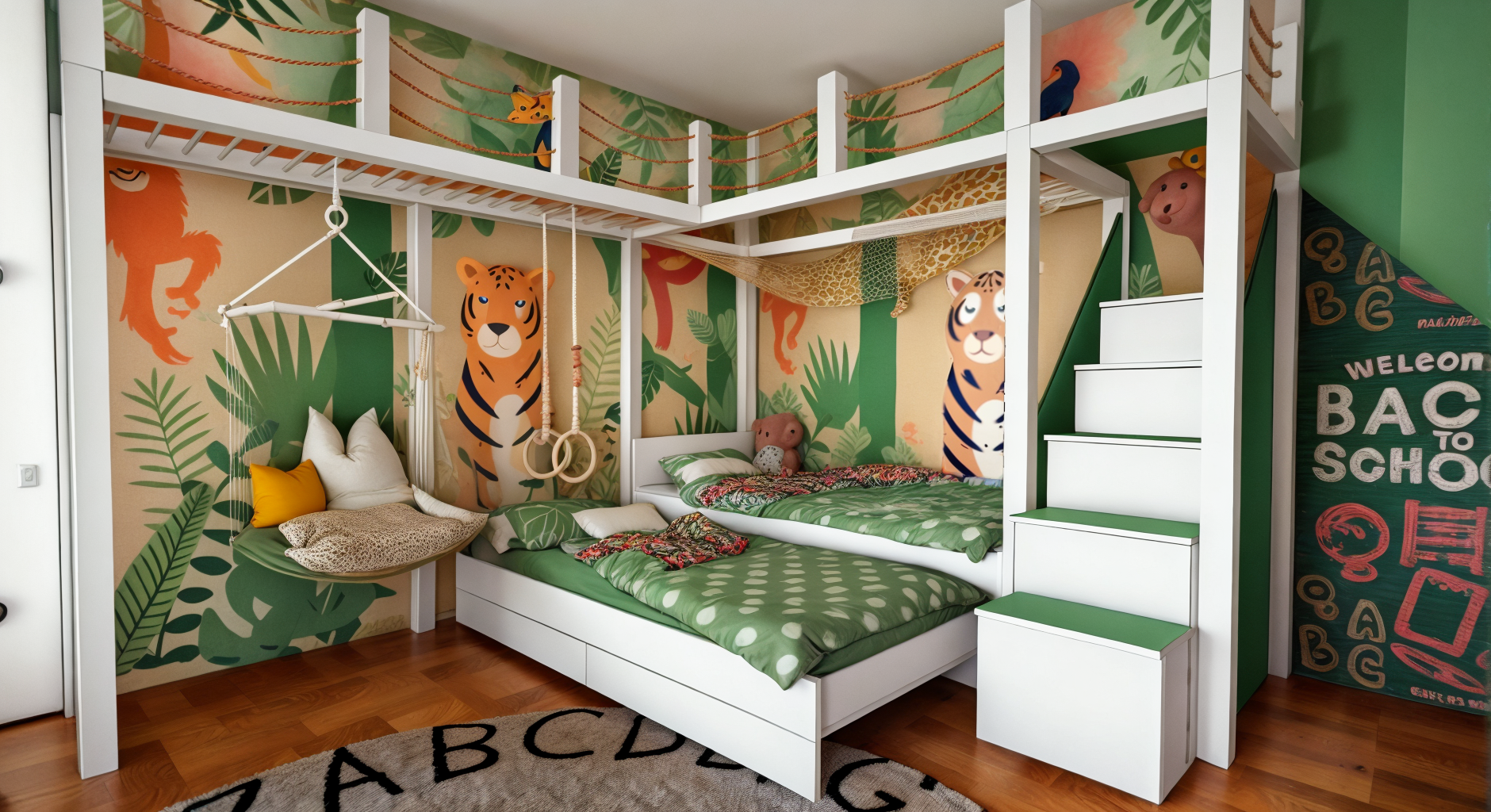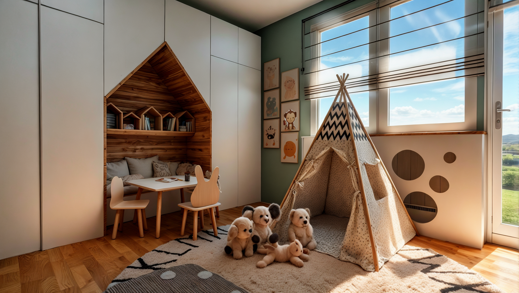 The Nikolić family bought an apartment in Šabac for their family of four with the idea that their two boys would have their own big room that would be a real little empire and playground. The room includes a swing and climbing frames, as well as a wigwam play area and a drawing area.