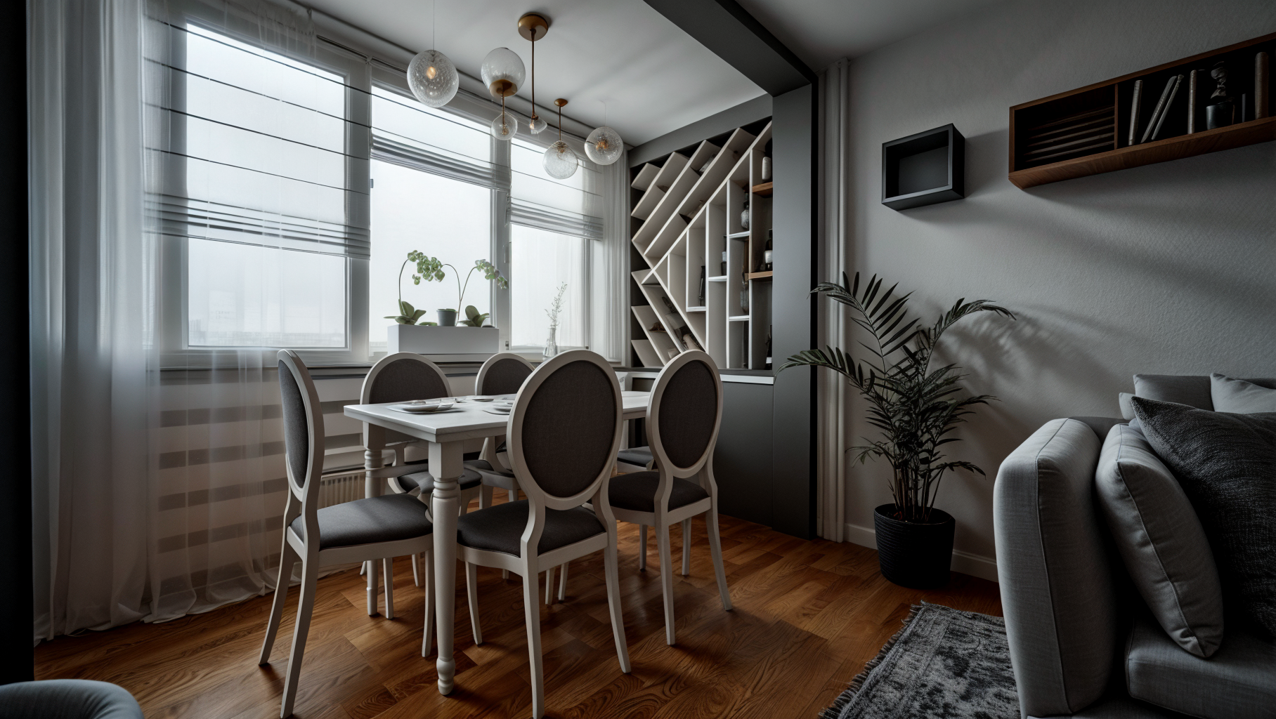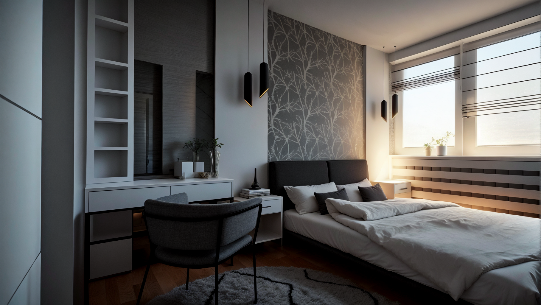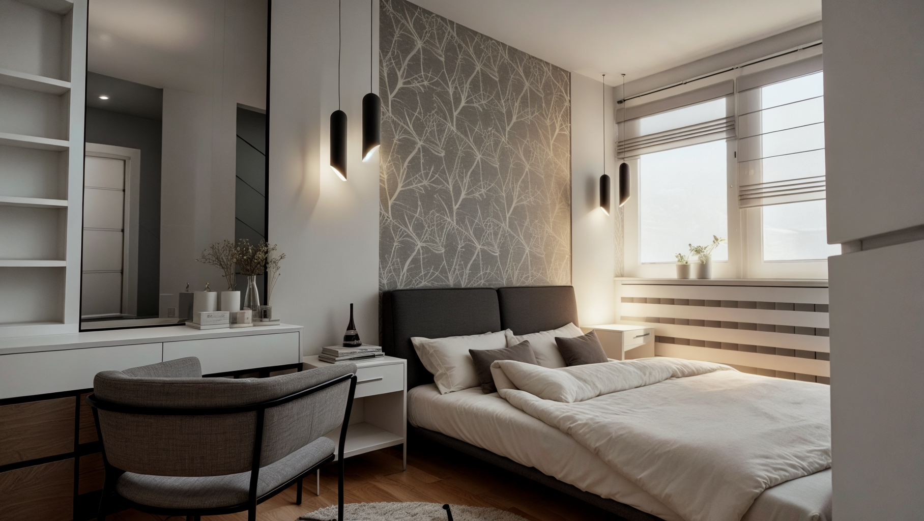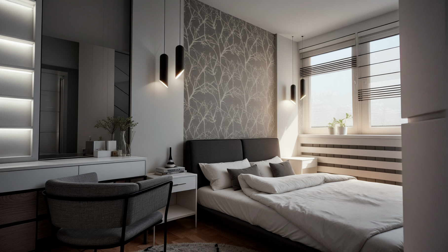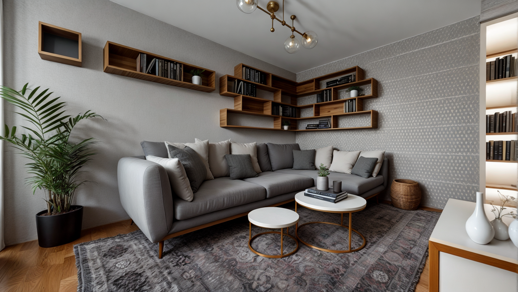 The entire space is in a palette of gray, green and blue shades, with plasterboard elements that emphasize the dynamics of the space, as well as wallpapers that make the space warmer.