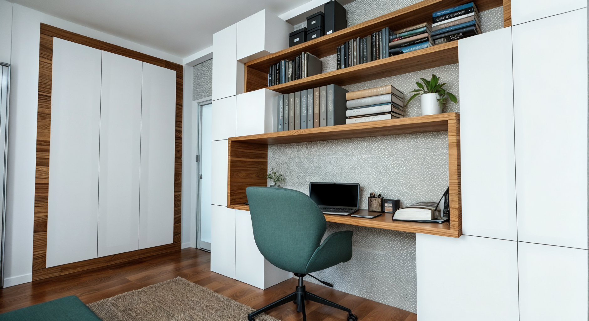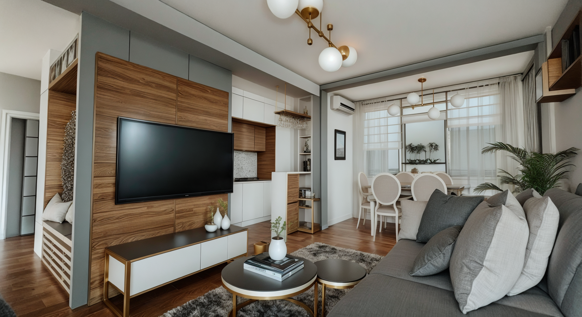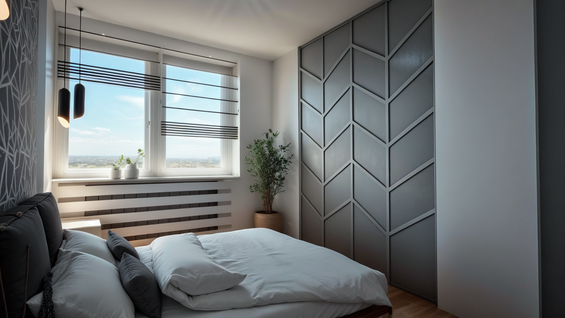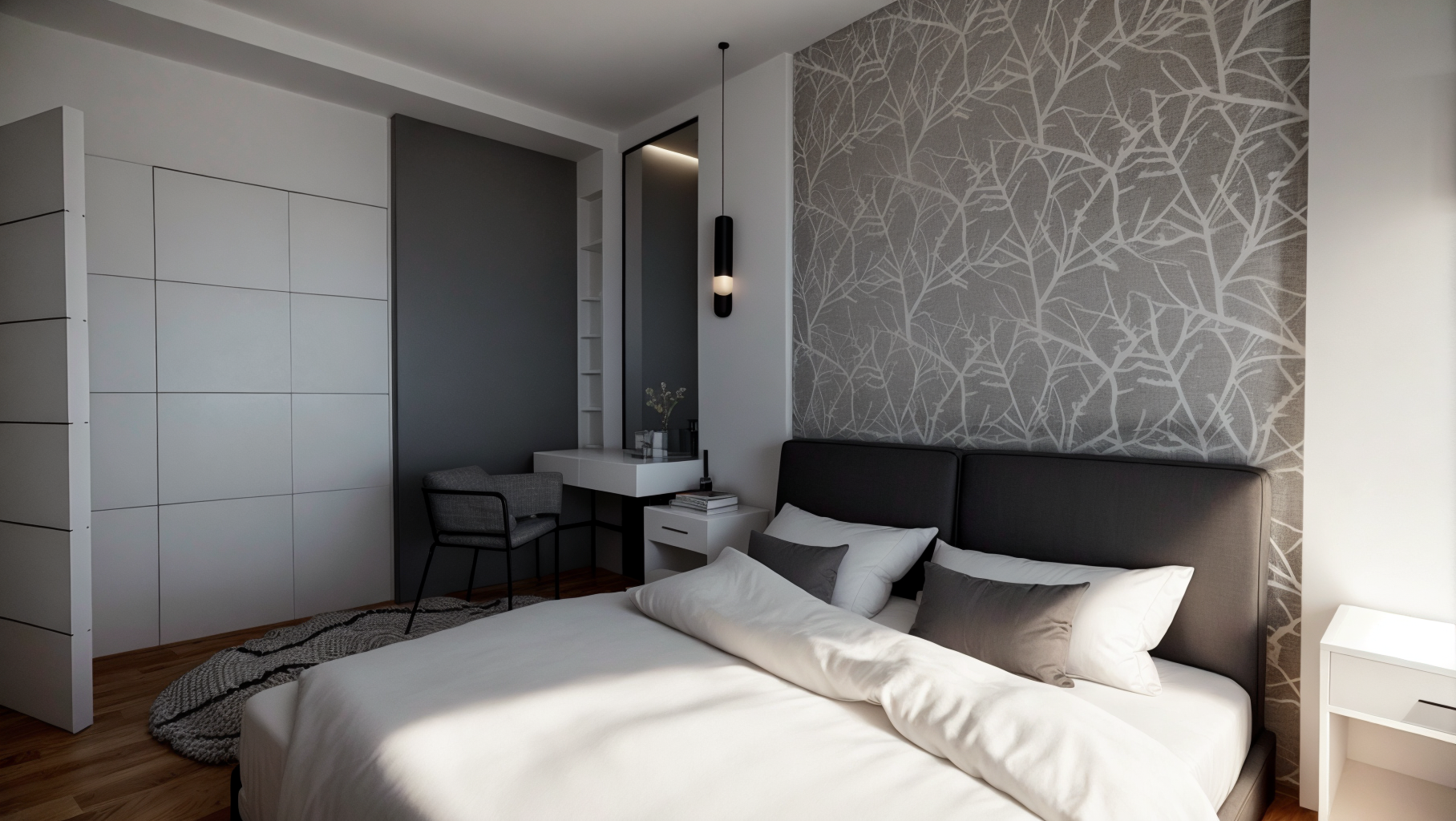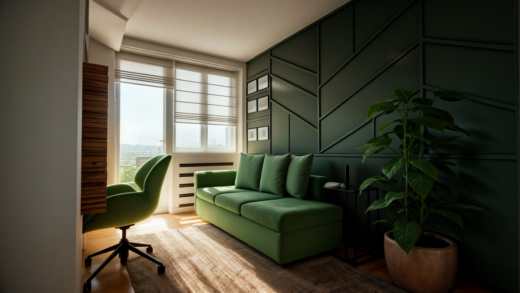 The entire space is in a palette of gray, green and blue shades, with plasterboard elements that emphasize the dynamics of the space, as well as wallpapers that make the space warmer.