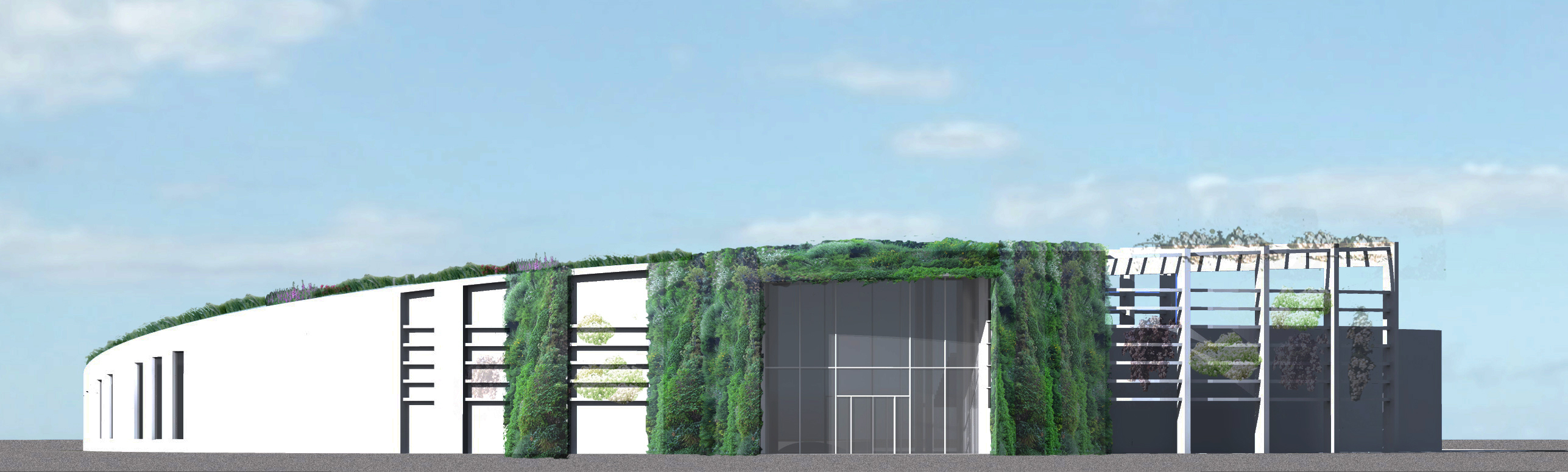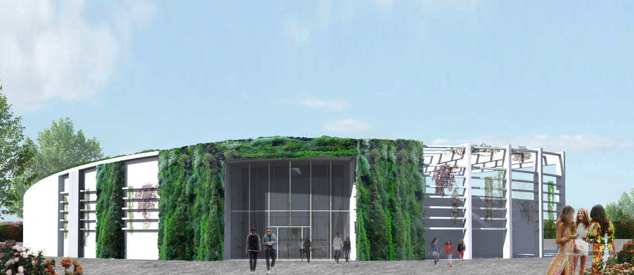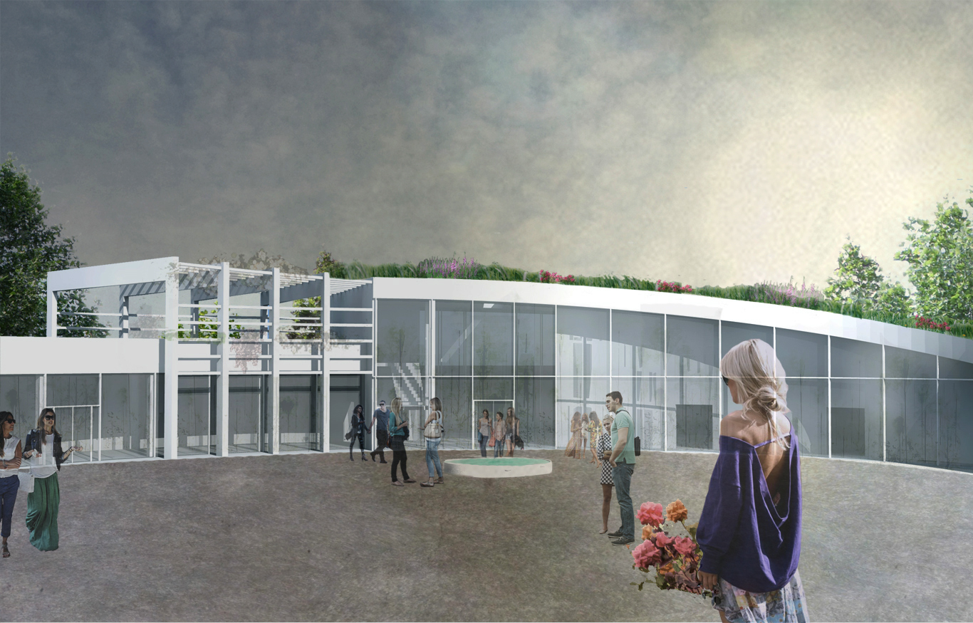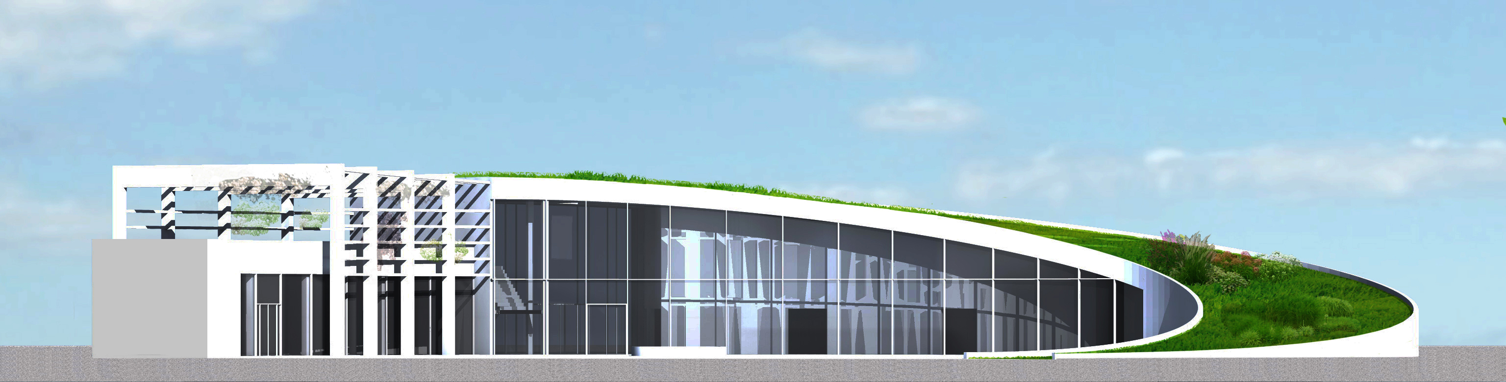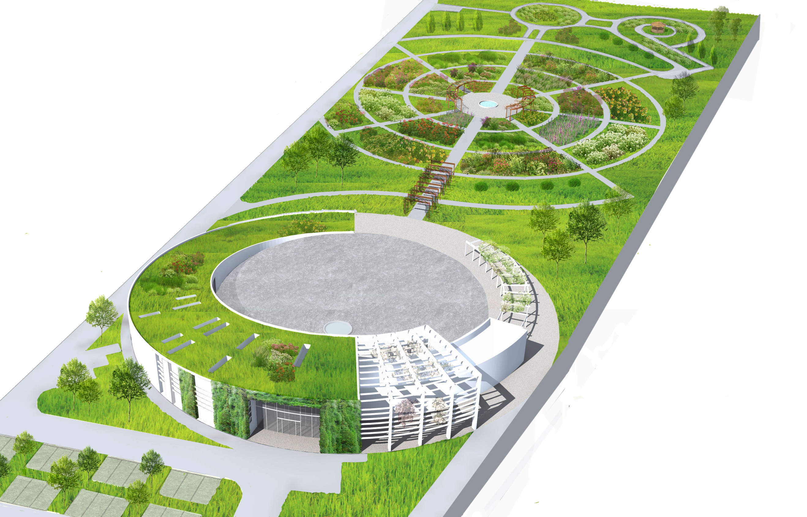 Educational Center form is inspired by organic shapes, in order to fit the context of nature (environment) better. The building is basically a part of a circular ring . The highest part of the building is in the entrance area of the building (on the west ), and its height is reduced towards the northern and eastern part of the rosarium, where it connects with the landscaping . Thus, the idea that the object in its form looks like it grew spontaneously from the land, is realized. The building is wrapped around the square. The educational part of the building (Educational Center), with ancillary facilities is occupying most of the area. It consists of exhibition halls, conference halls (for 50 users), two classrooms and a workshop. The Management of the Educational Center consists of two small offices, office for the manager, a kitchenette and toilet. This part of the building has a separate entrance connected to the northern service road, and direct access to the square. Service area is consisted of the cafeteria with the multifunction storage, bookstore, wardrobe and sanitary facilities. Due to its geometry, i.e. the increased size of the entry zone, this part of the building has more stores (ground floor and first floor). Change of the floors refers to the bookstore in which galleries and access to the roof garden of the cafe are established. The cafe is the ground floor of the building with a flat roof on which is formed a rooftop garden, to which one can access through vertical communication. Access to the staircase is straight from the entrance hall.