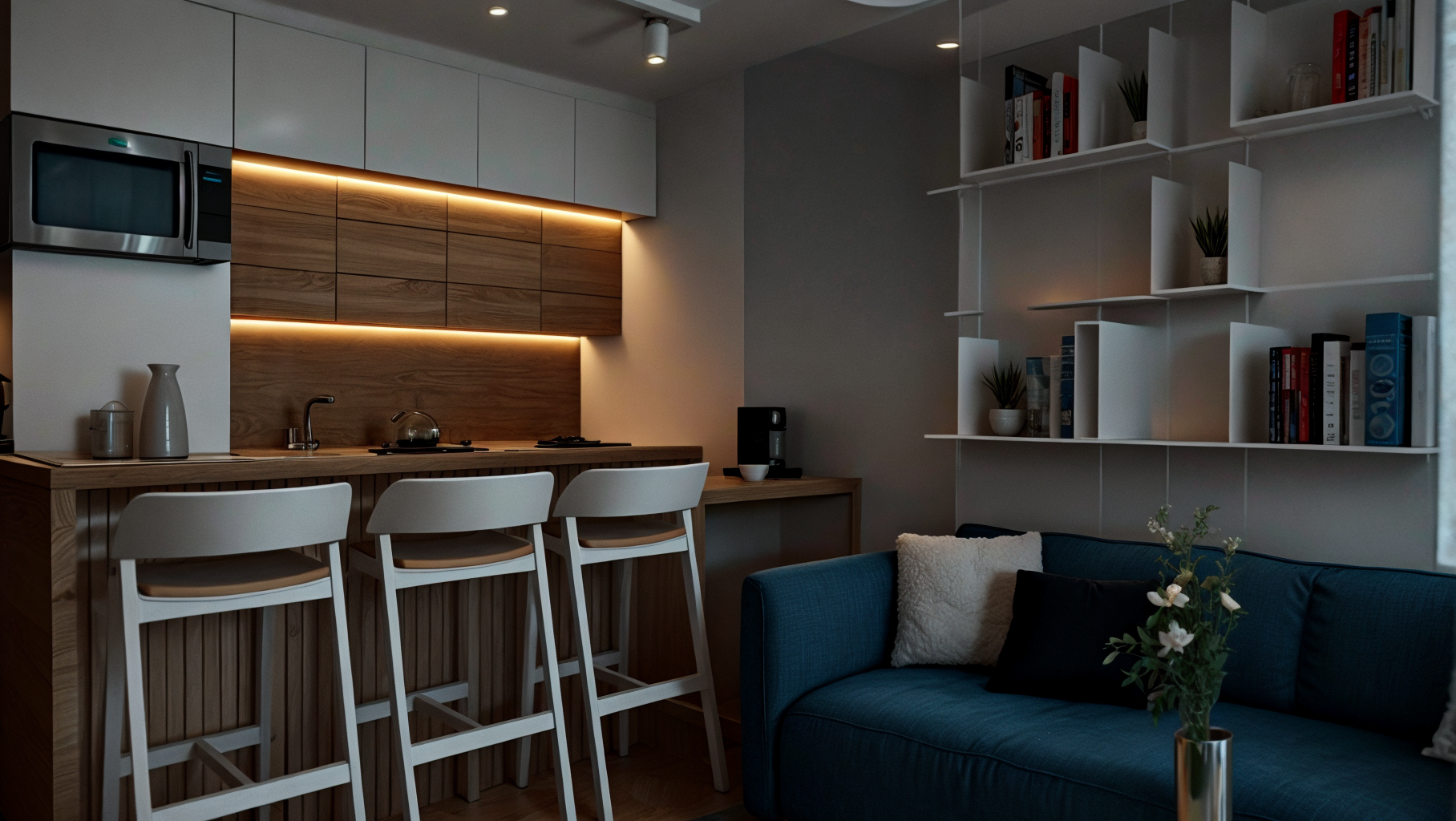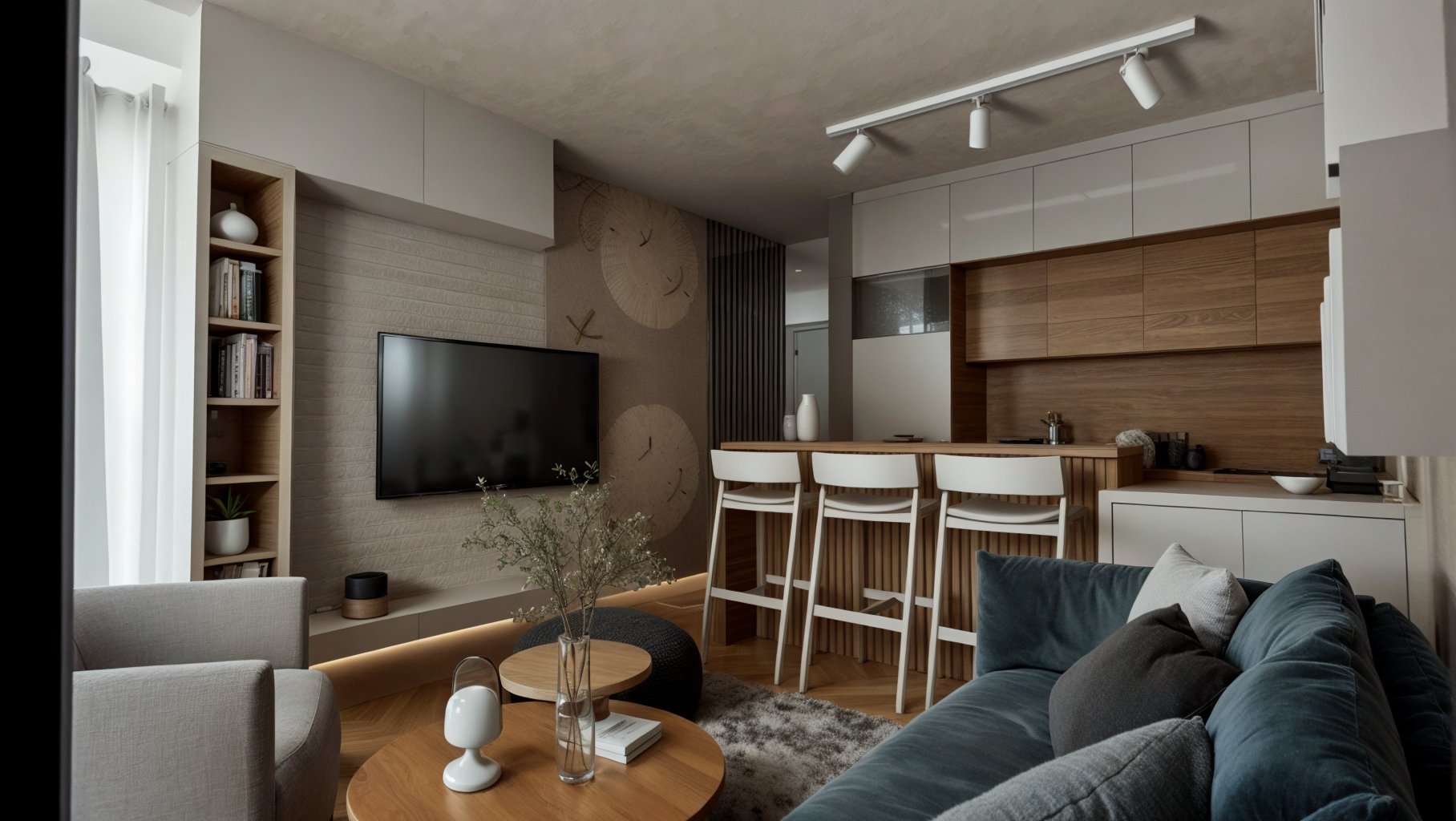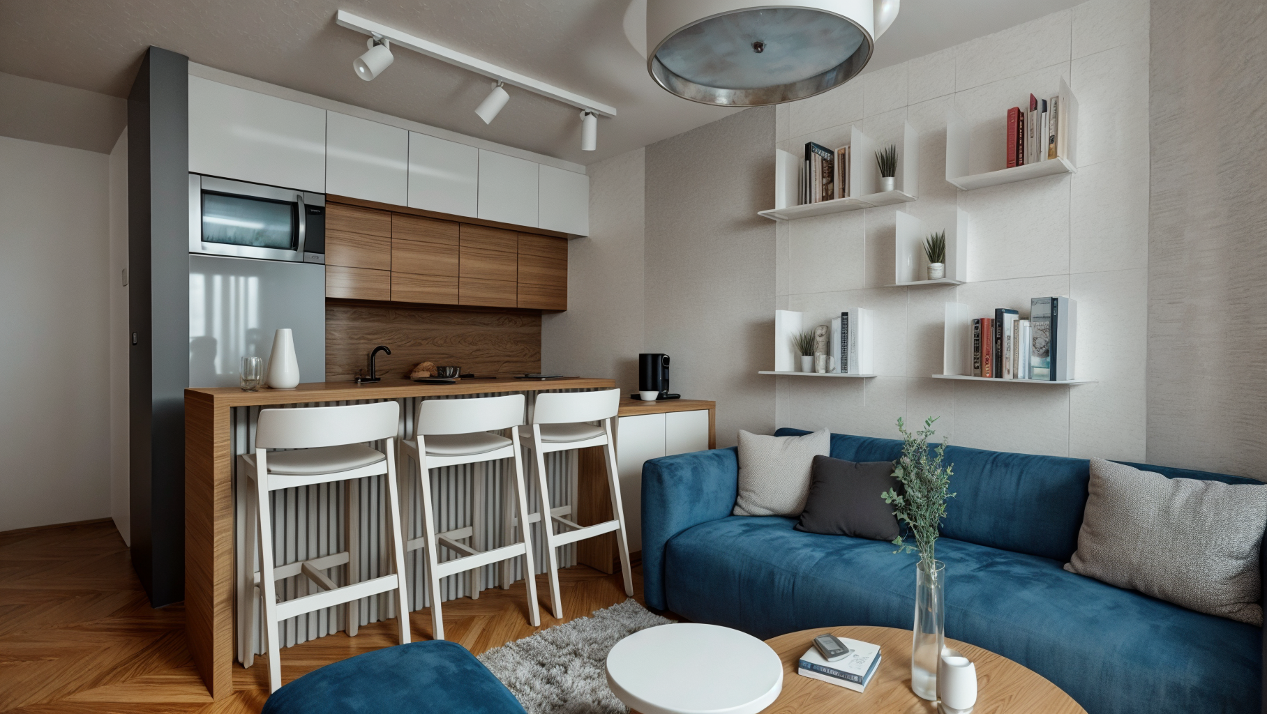 The living room is separated from the kitchen area by a bar/island that also contains storage space. The kitchen is only 180 cm long, but the space is used in the best way so that it contains all the necessary elements and the work area.