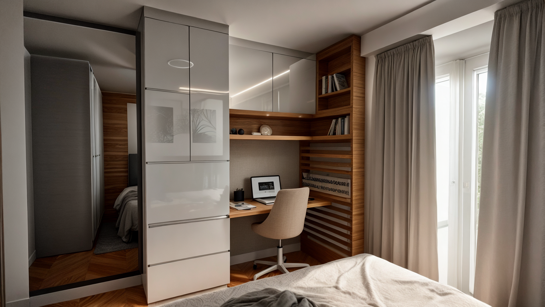 In the bedroom, the furniture is white and custom designed. The workspace is flexible and modular so that in the future it can be transformed into additional storage space, a library and the like, without disturbing the rest of the furniture.
