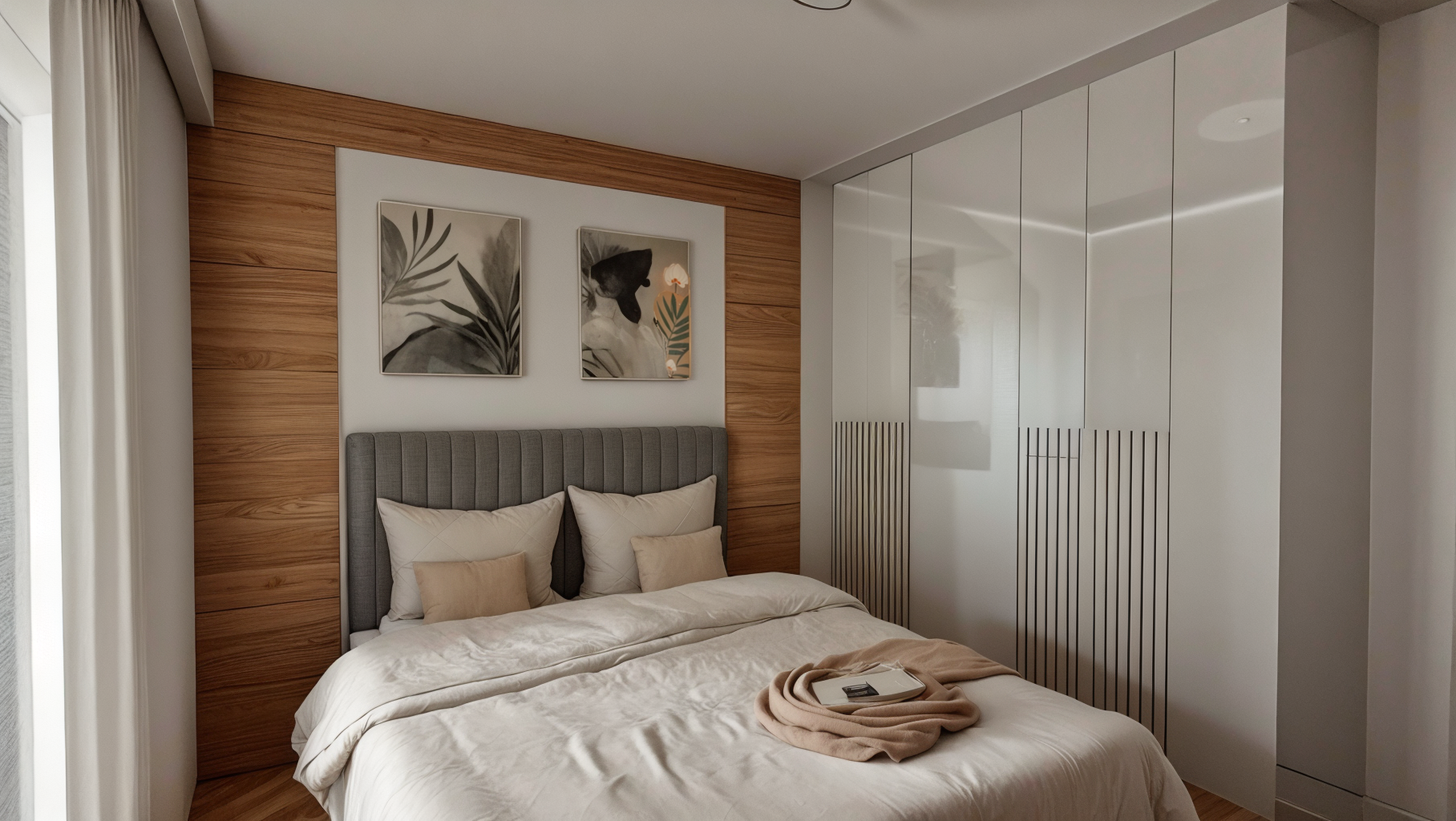 The walls are covered with wooden panels or wallpaper to emphasize the cozy atmosphere of this space. The colors are from the cooler spectrum of gray and blue and are complemented by the color of natural oak.