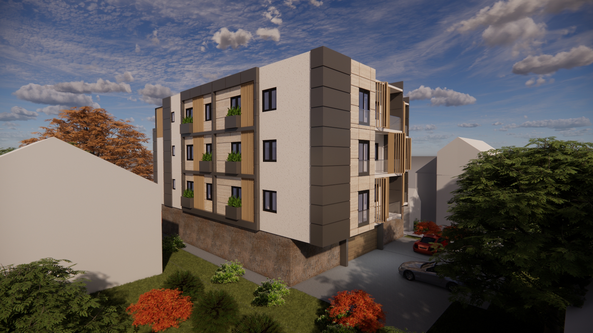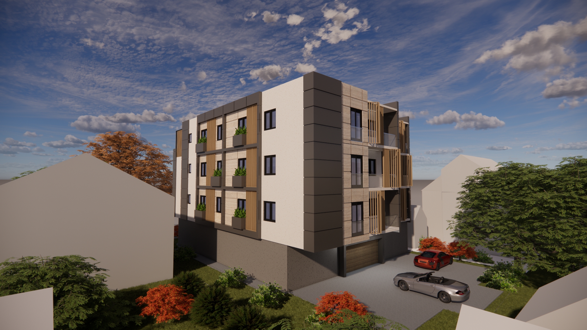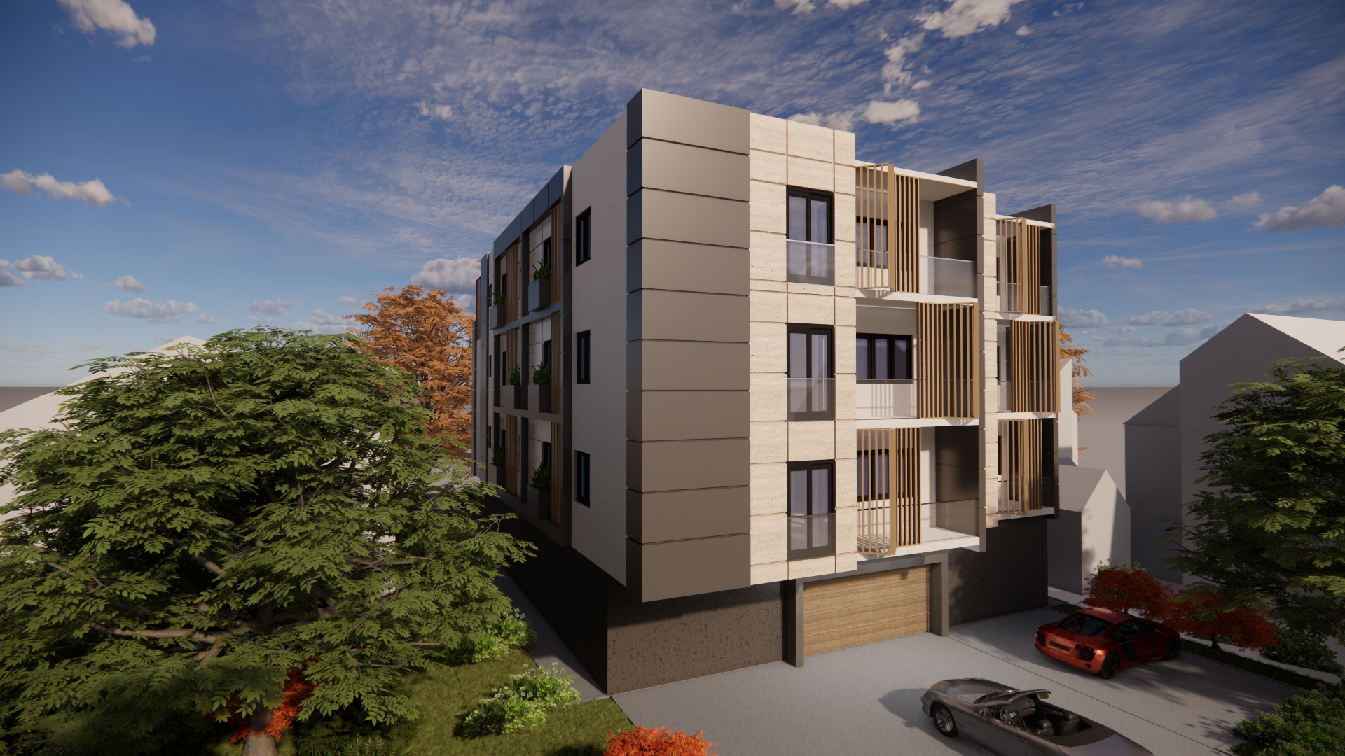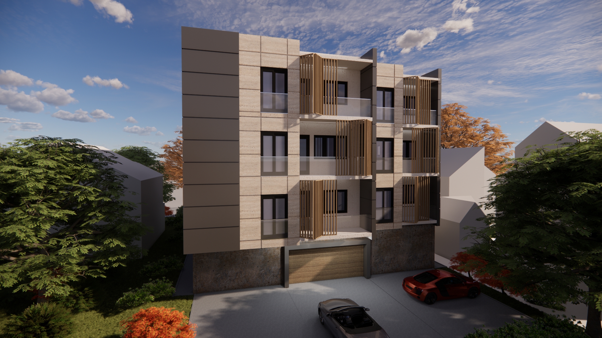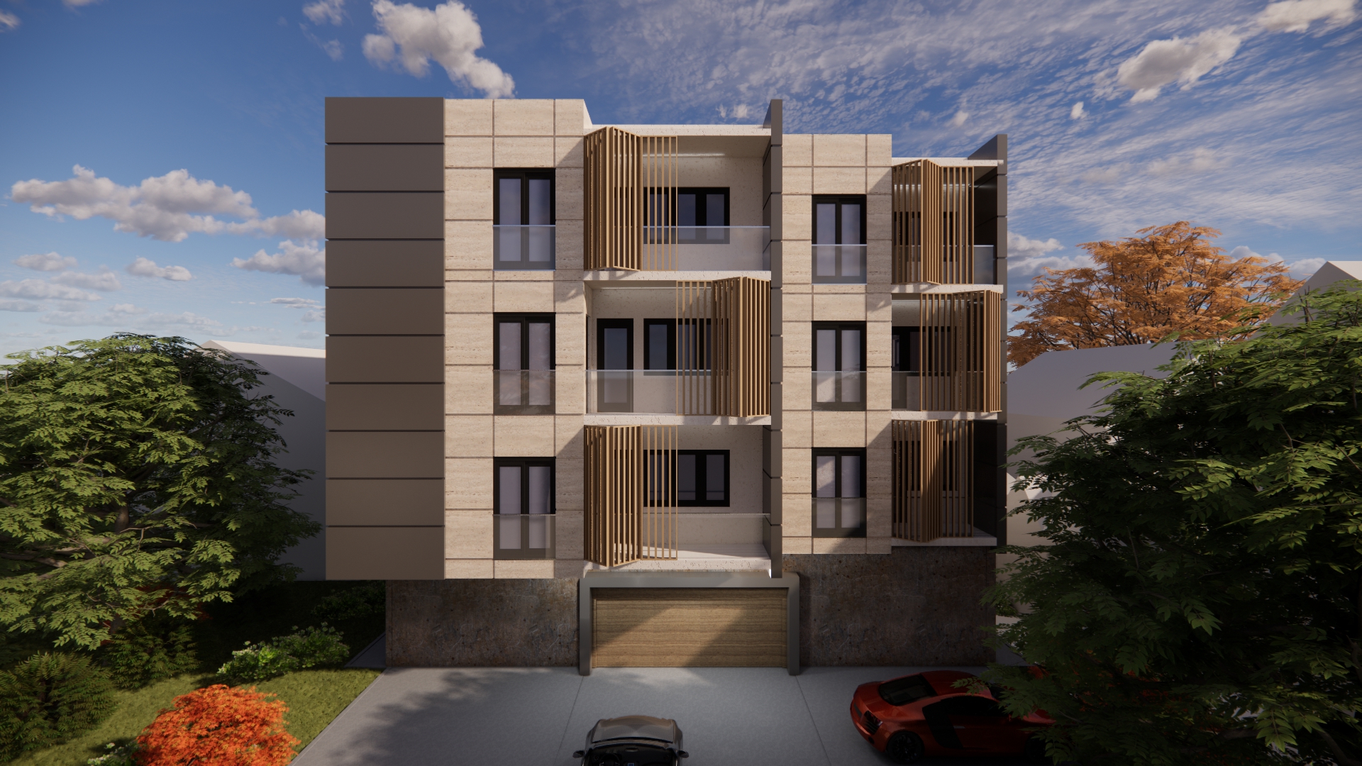 On the ground floor of the building, an entrance area with a windshield, an elevator and a staircase is planned. In addition to the windshield, gas boiler room, stairs and elevator, parking spaces and storage rooms are planned on the ground floor. The number of parking spaces overlooked on the ground floor is a total of 14, of which 8 are in the garage. In addition to the parking space in the yard, 6 parking spaces are planned. A total of 10 apartments are planned to be built on the floors, 5 on each floor. A total of 4 apartments are planned to be built on the detached floor. The total gross area of the building is about 1,400m2. The construction of the facade walls of the ground floor and upper floors is planned from the „klimabloc“ d=25cm. On the ground floor of the building, over the facade walls of the air conditioning unit, a layer of stone wool with the thickness of 10 cm is planned, and over it, the construction of a demit facade (includes glue, mesh and decorative colored plaster). On the floors of the building, a ventilating facade is installed over the wall of „klimabloc“ unit on the outside, and as the final layer, stone slabs in travertine pattern, as well as in dark gray color, with the associated substructure are provided. Sliding wooden panels are provided in the area of the loggia and the second floor. They are made of steel frame construction, filled with wooden slats made of natural oak, with appropriate impregnation. The frames are mounted on a rail sliding system, which allows customization to the user. Tenants will control the penetration of light into the apartment by moving and rotating each panel, which will give additional dynamics to the facade. The wooden panels on the side facades are intended to be fixed, since they are located in the area of the stair core on the north-east facade and as a toilet window mask on the south-west facade.
