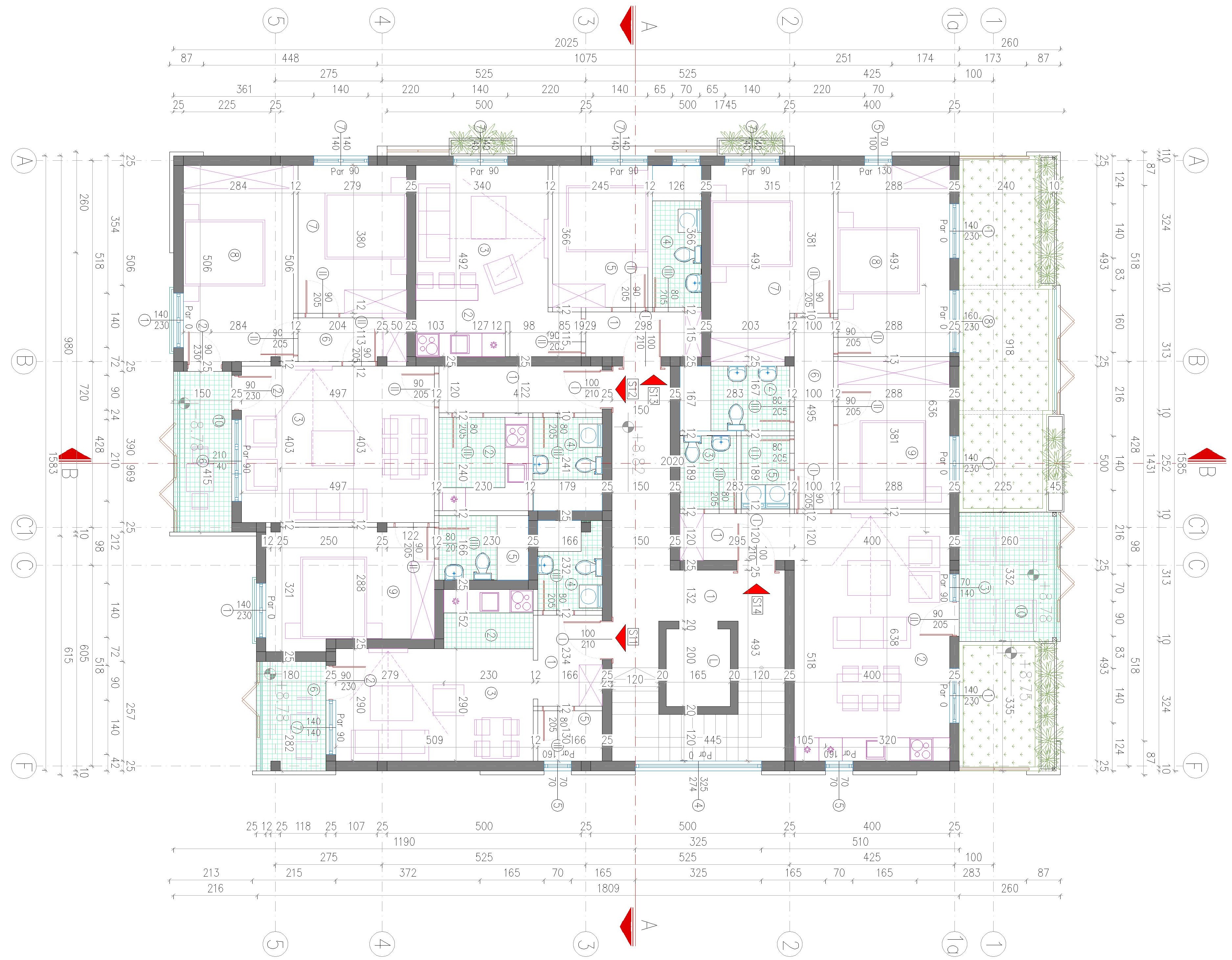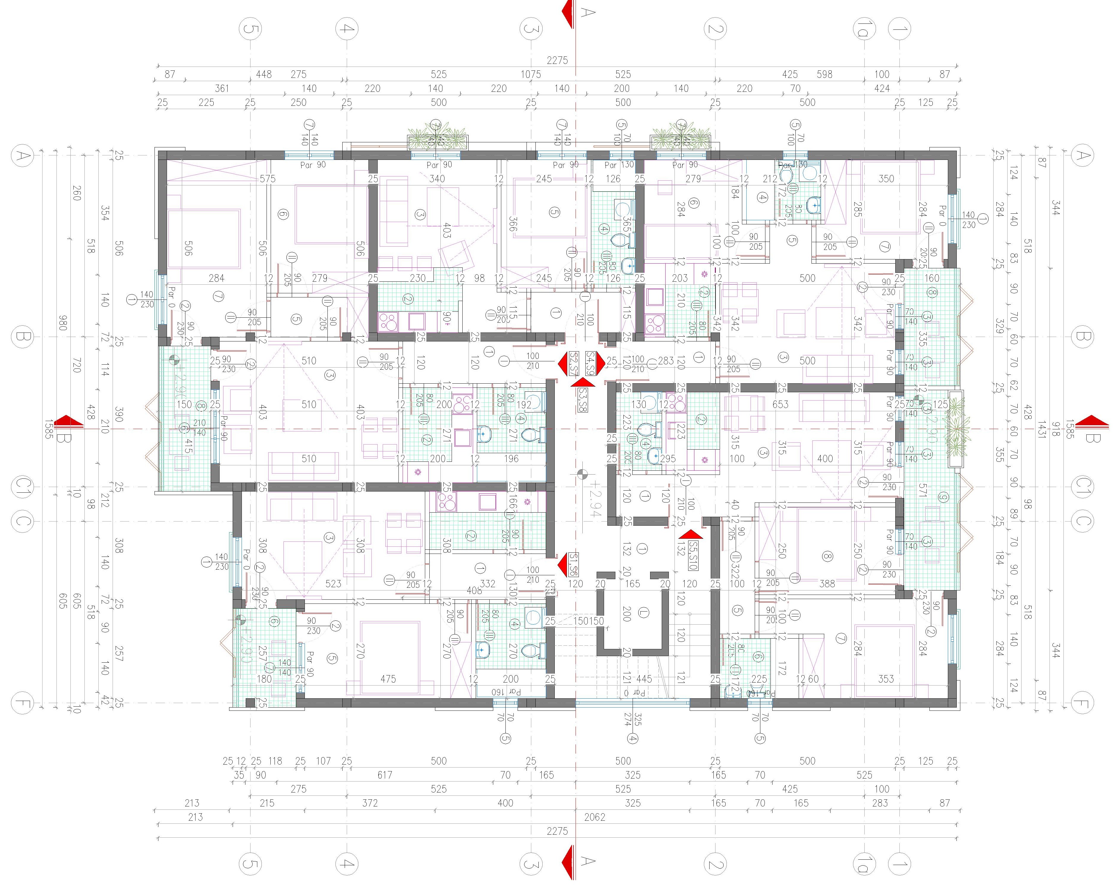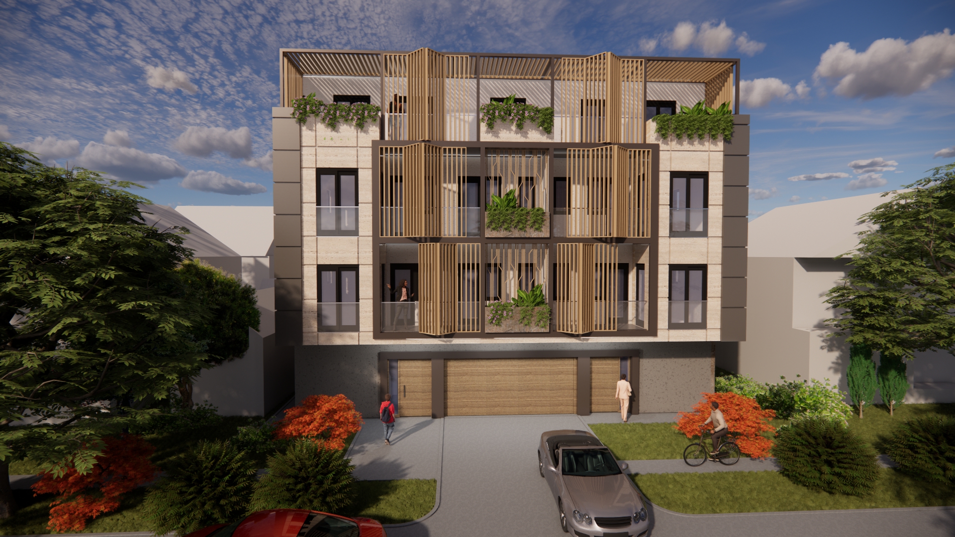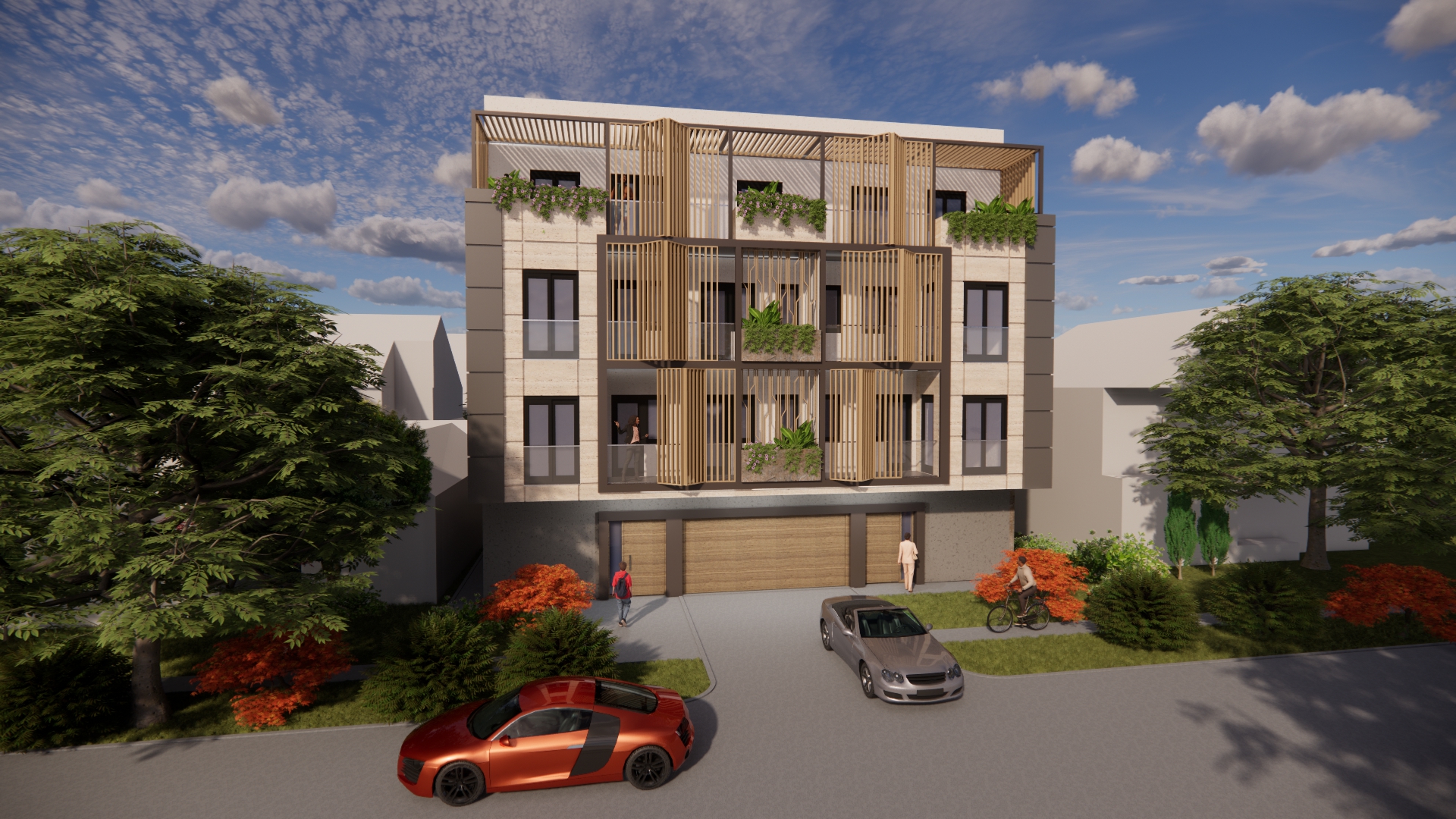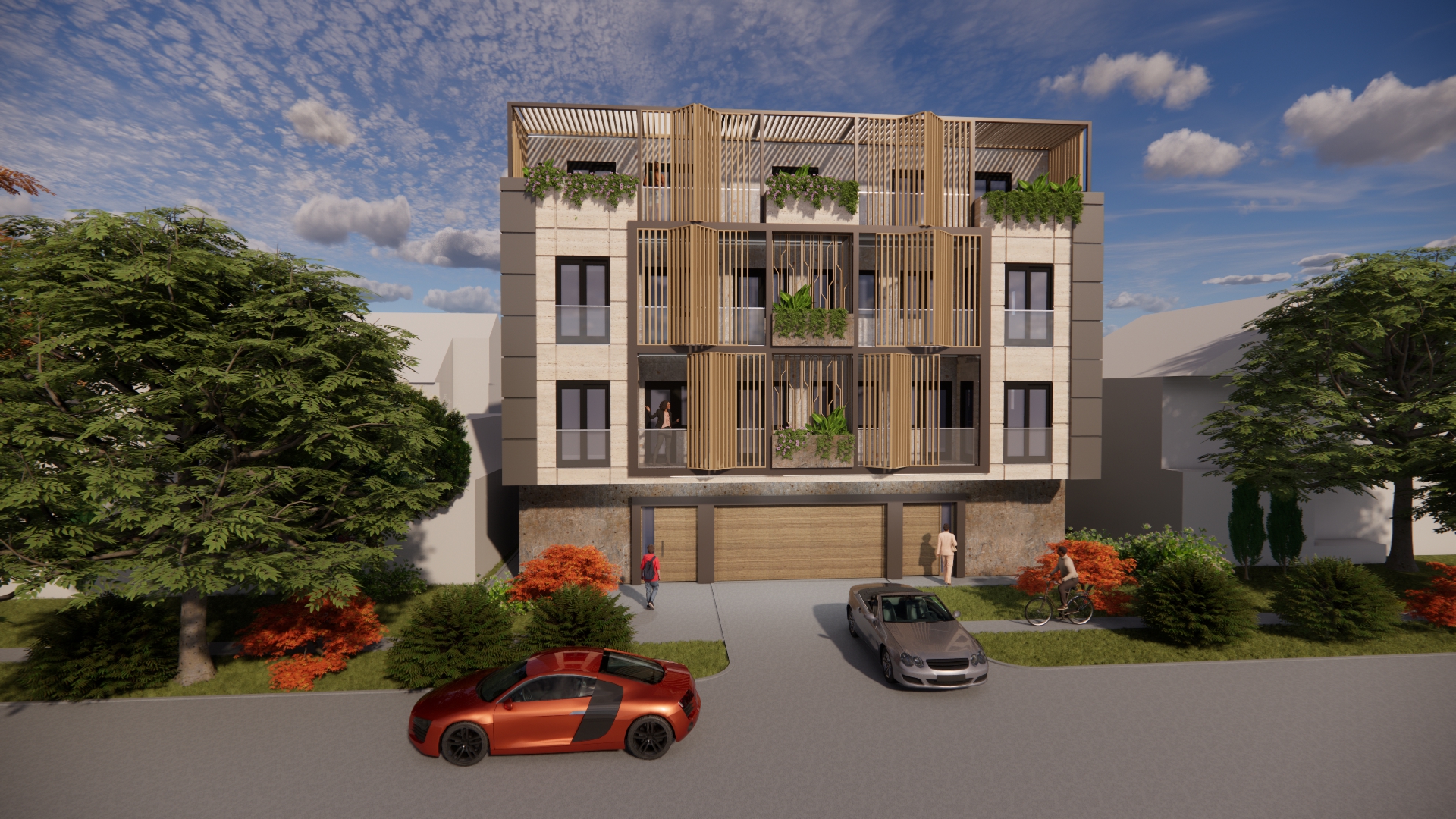 On the ground floor of the building, an entrance area with a windshield, an elevator and a staircase is planned. In addition to the windshield, gas boiler room, stairs and elevator, parking spaces and storage rooms are planned on the ground floor. The number of parking spaces overlooked on the ground floor is a total of 14, of which 8 are in the garage. In addition to the parking space in the yard, 6 parking spaces are planned. A total of 10 apartments are planned to be built on the floors, 5 on each floor. A total of 4 apartments are planned to be built on the detached floor. The total gross area of the building is about 1,400m2. The construction of the facade walls of the ground floor and upper floors is planned from the „klimabloc“ d=25cm. On the ground floor of the building, over the facade walls of the air conditioning unit, a layer of stone wool with the thickness of 10 cm is planned, and over it, the construction of a demit facade (includes glue, mesh and decorative colored plaster). On the floors of the building, a ventilating facade is installed over the wall of „klimabloc“ unit on the outside, and as the final layer, stone slabs in travertine pattern, as well as in dark gray color, with the associated substructure are provided. Sliding wooden panels are provided in the area of the loggia and the second floor. They are made of steel frame construction, filled with wooden slats made of natural oak, with appropriate impregnation. The frames are mounted on a rail sliding system, which allows customization to the user. Tenants will control the penetration of light into the apartment by moving and rotating each panel, which will give additional dynamics to the facade. The wooden panels on the side facades are intended to be fixed, since they are located in the area of the stair core on the north-east facade and as a toilet window mask on the south-west facade.