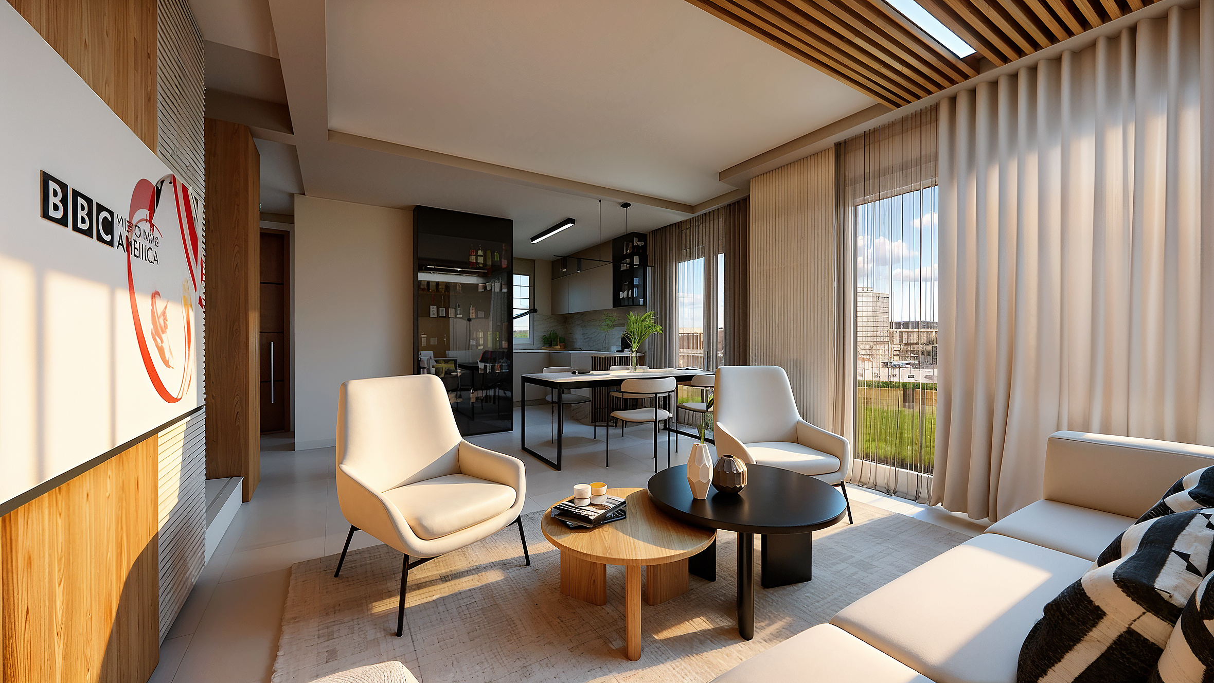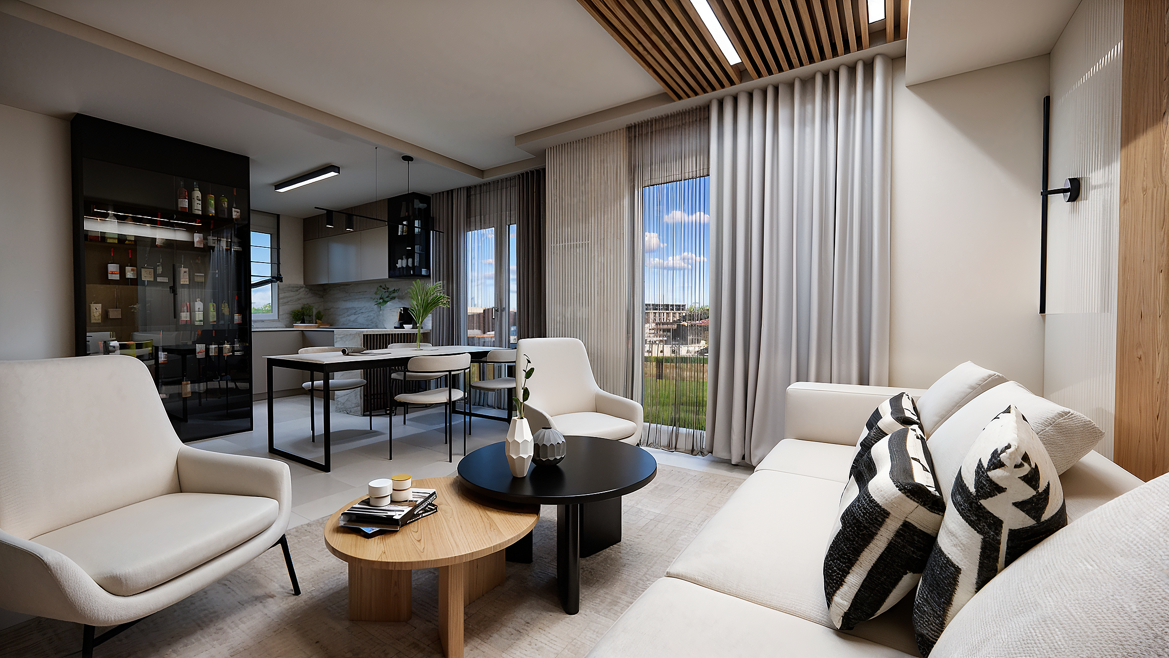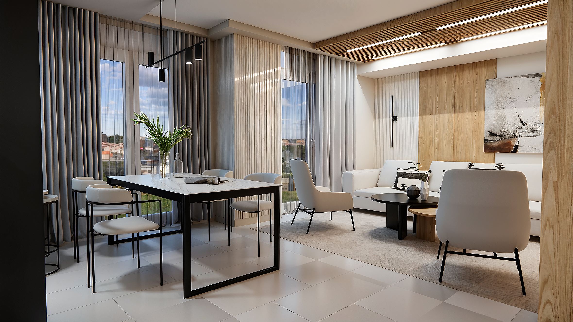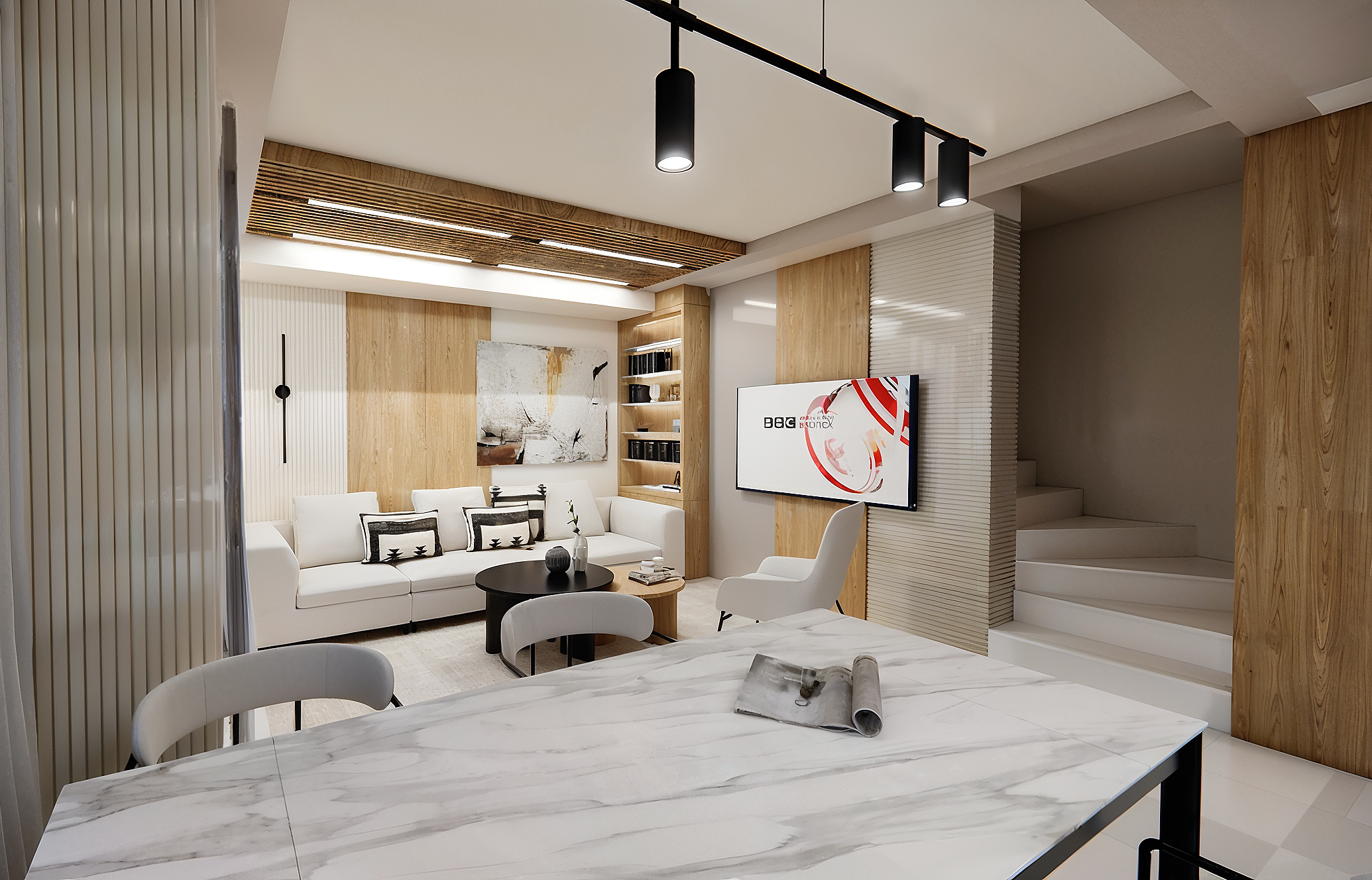 The ground floor of the apartment in question contains a living room, dining room and kitchen in a modern “open space” concept. The living area also includes a guest toilet located directly next to the apartment’s front door. The living area, according to the wishes of the investor, was designed in warm beige tones and details in black, which are carried through the space in places. Wall panels and draperies make the atmosphere warm and cozy, for family gatherings. A special challenge in the design of this space was the internal staircase, which is positioned in the living room and which, with its glass railing, dominates this space. The investor’s need was to hide or close the staircase so that it is not visible from the living room, but also to make the best use of the space under the stairs for storage. This situation was solved by creating a library and a partition wall in front of the staircase. The sliding doors for the entrance to the storage area are integrated into the wall panels behind the TV area and give the impression of a monolithic wall. Part of the wall is covered with veneered mediapan, while one segment is treated with mediapan with grooves, which brings dynamism to the space.