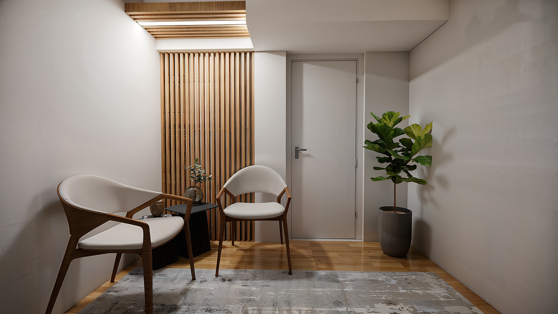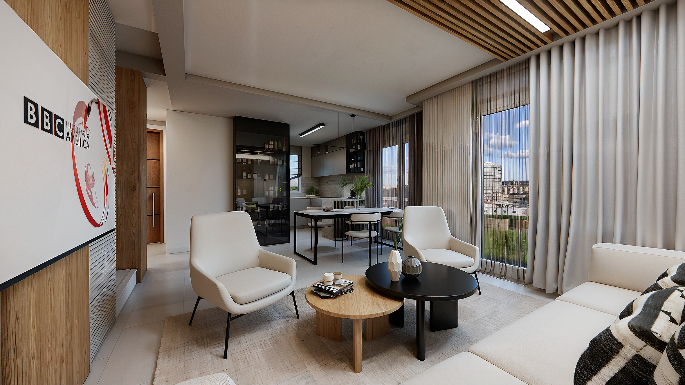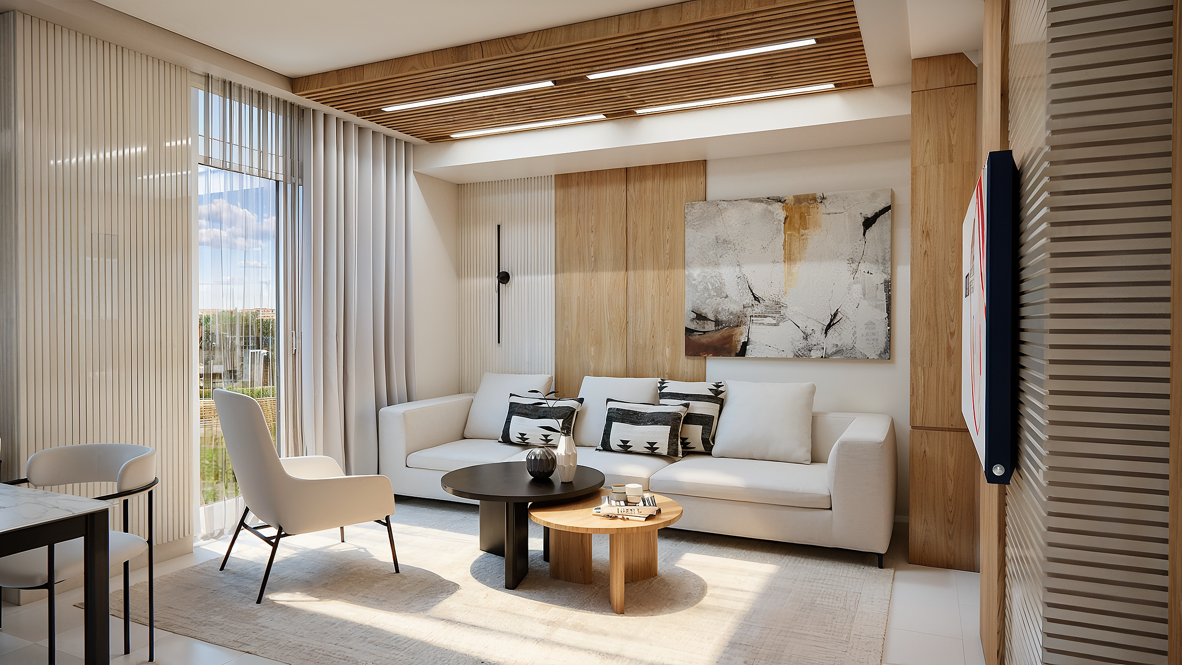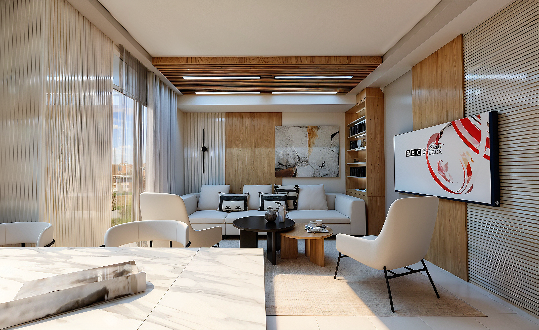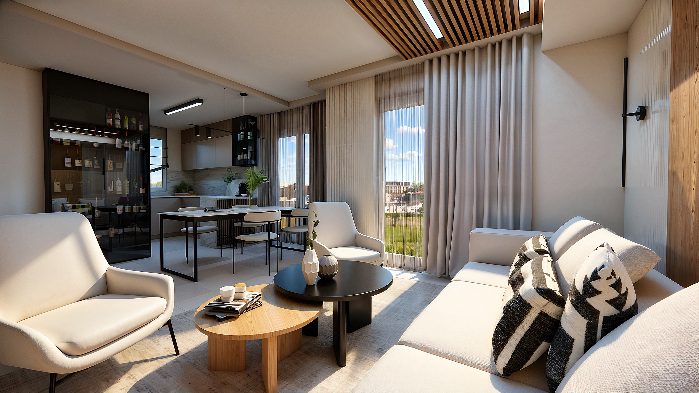 The ground floor of the apartment in question contains a living room, dining room and kitchen in a modern “open space” concept. The living area also includes a guest toilet located directly next to the apartment’s front door. The living area, according to the wishes of the investor, was designed in warm beige tones and details in black, which are carried through the space in places. Wall panels and draperies make the atmosphere warm and cozy, for family gatherings. A special challenge in the design of this space was the internal staircase, which is positioned in the living room and which, with its glass railing, dominates this space. The investor’s need was to hide or close the staircase so that it is not visible from the living room, but also to make the best use of the space under the stairs for storage. This situation was solved by creating a library and a partition wall in front of the staircase. The sliding doors for the entrance to the storage area are integrated into the wall panels behind the TV area and give the impression of a monolithic wall. Part of the wall is covered with veneered mediapan, while one segment is treated with mediapan with grooves, which brings dynamism to the space.