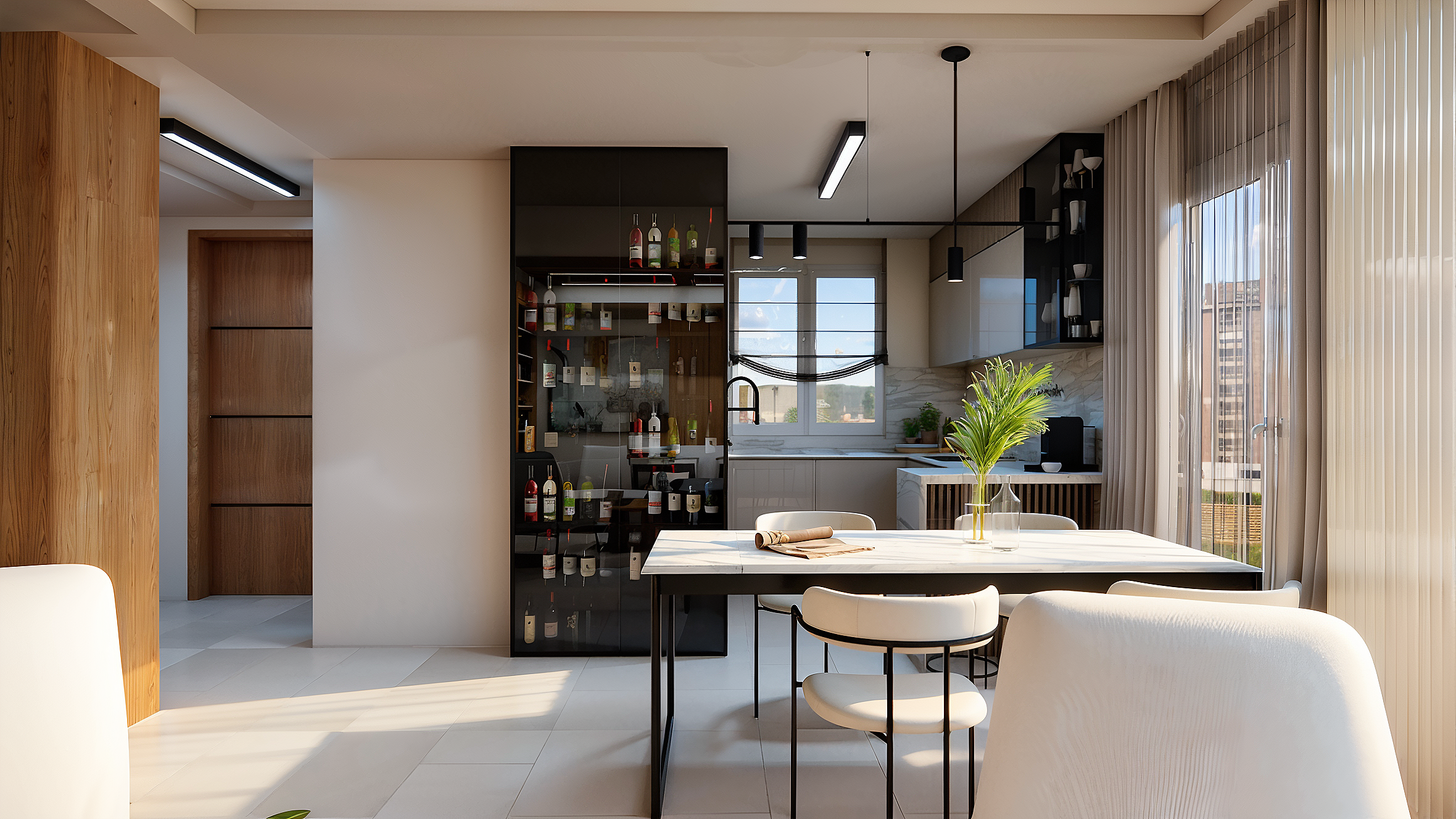 The dining table is located between the kitchen and the living room and ideally connects these two spaces, not only functionally, but with its color and design. Above the dining table is an attractive pendant in black.