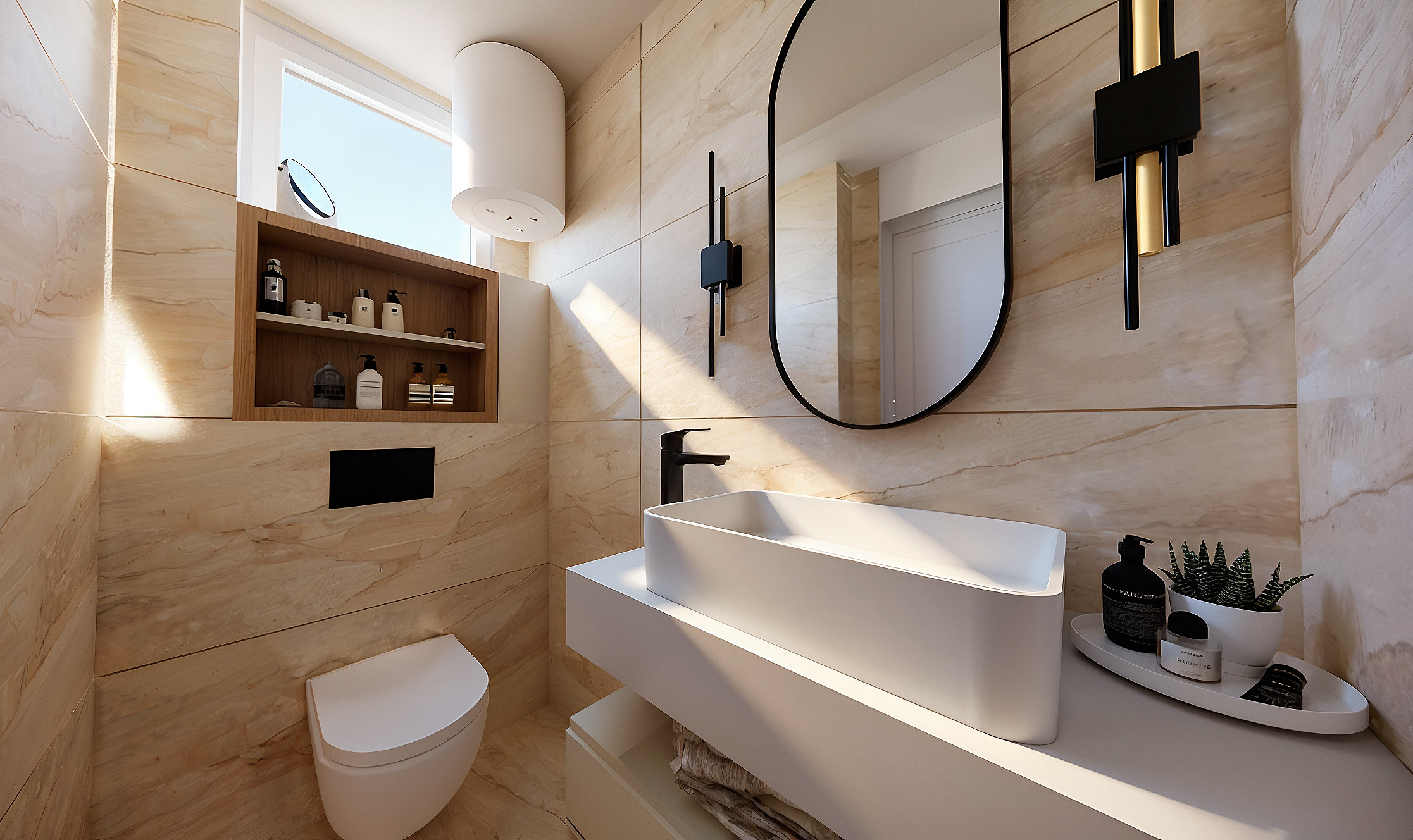 The kitchen is designed in a warm beige color with a black compact plate and black details in the form of a granite sink and faucet.