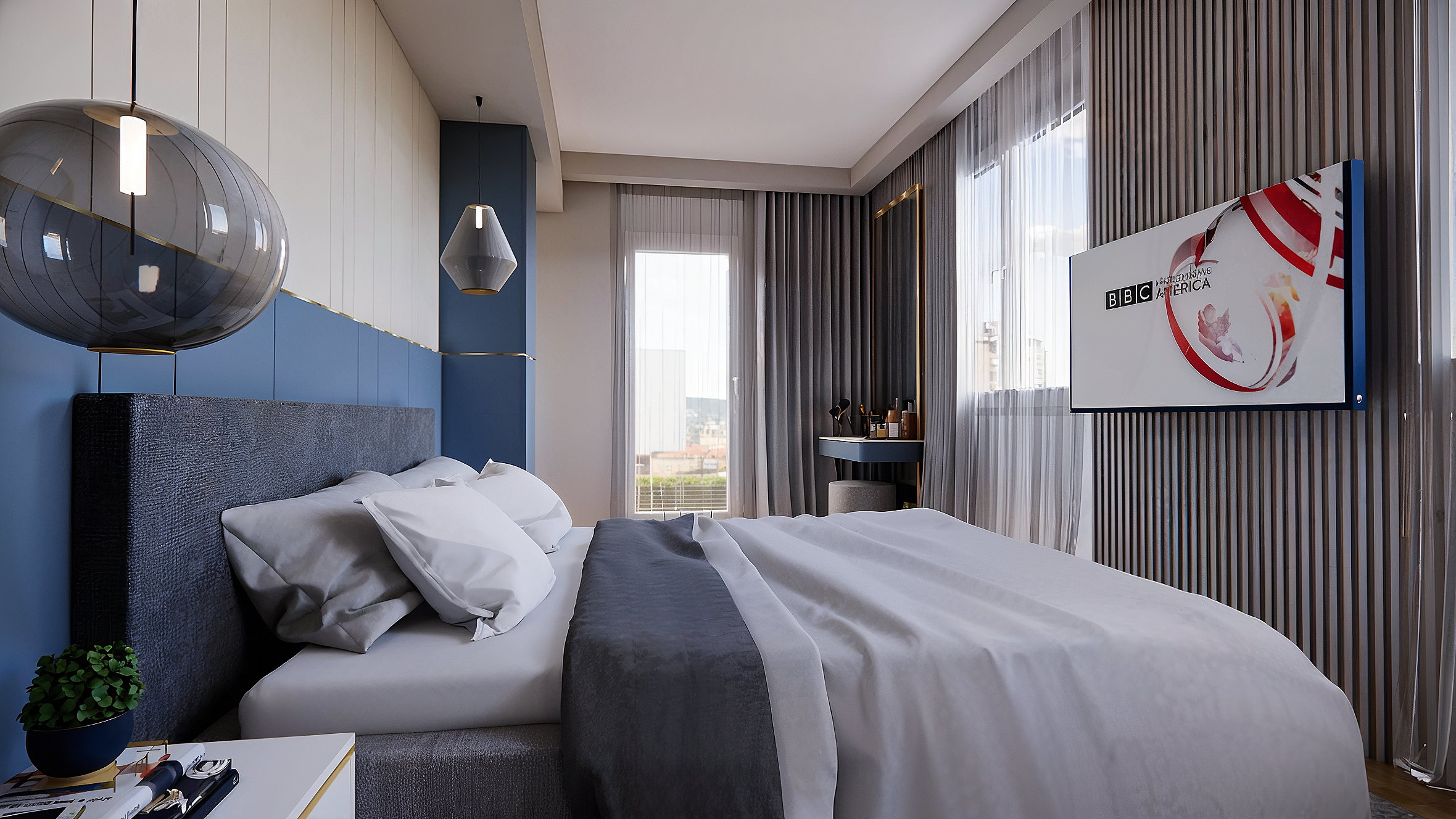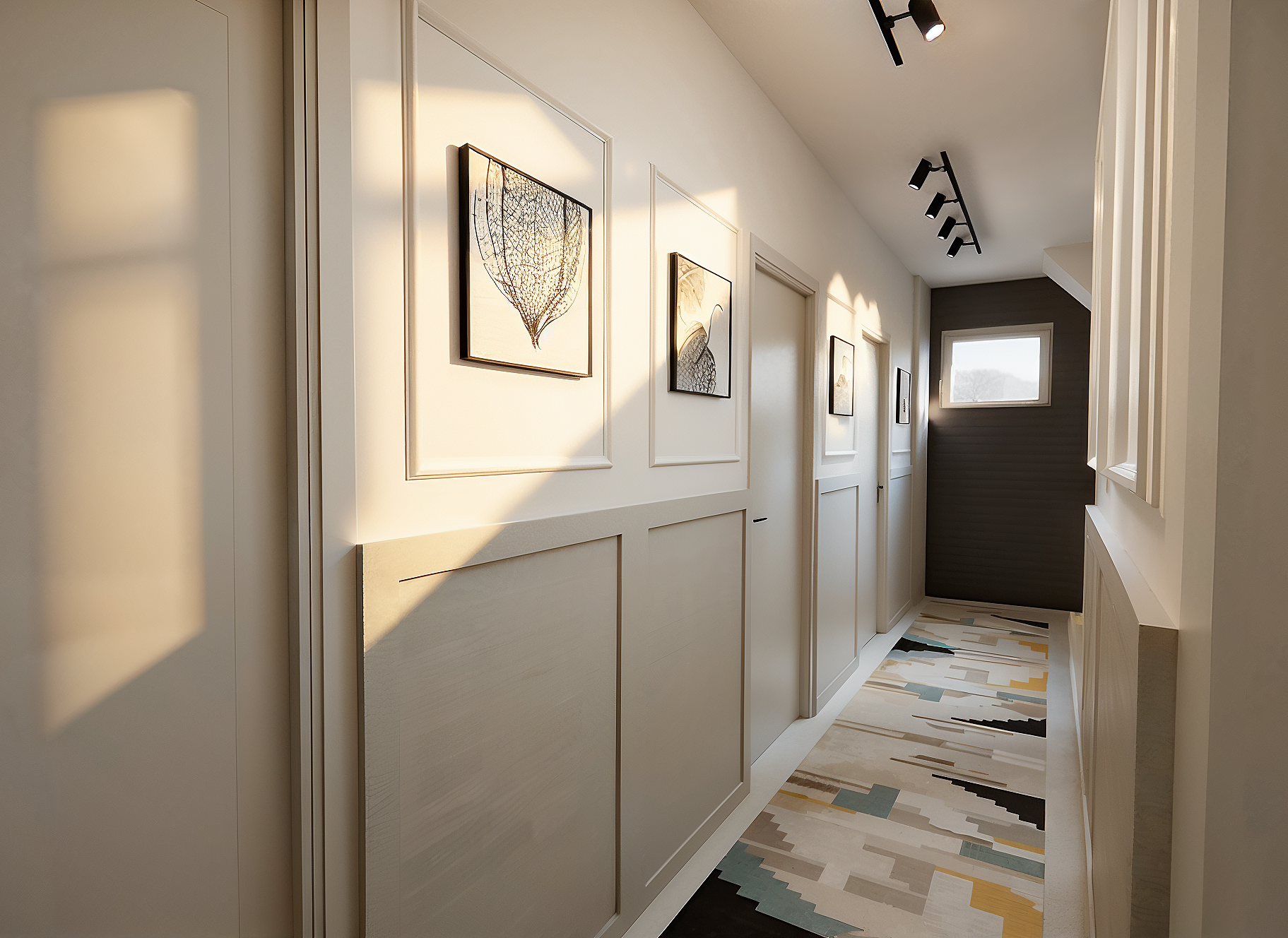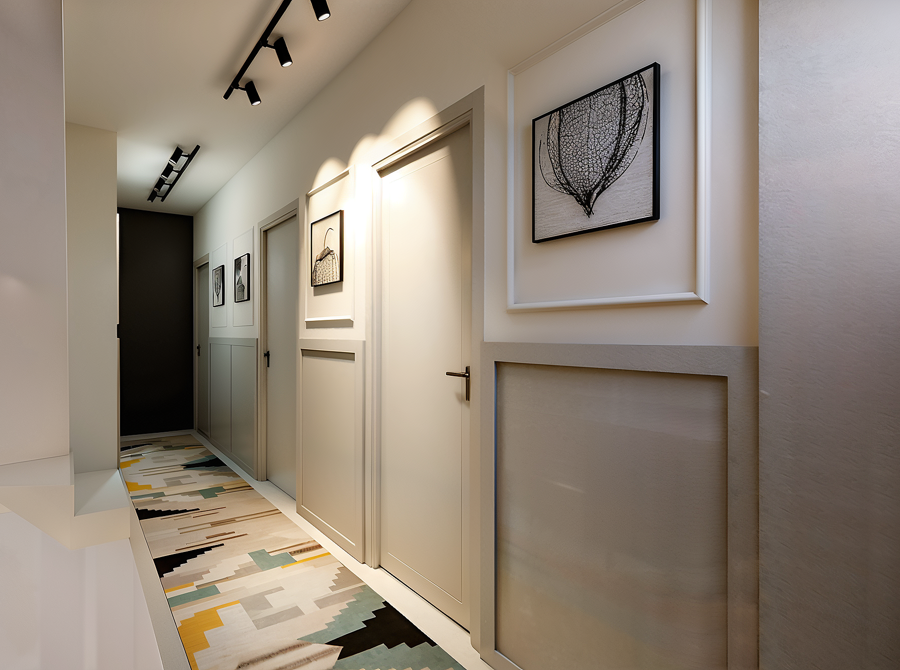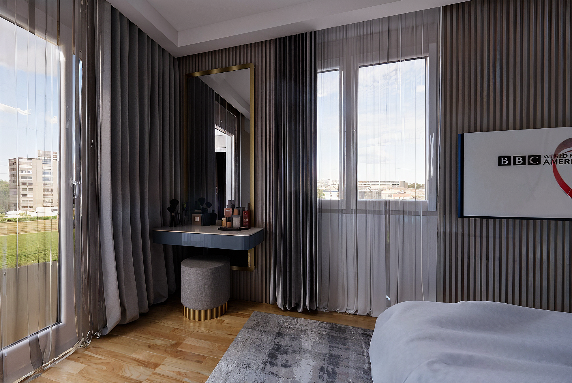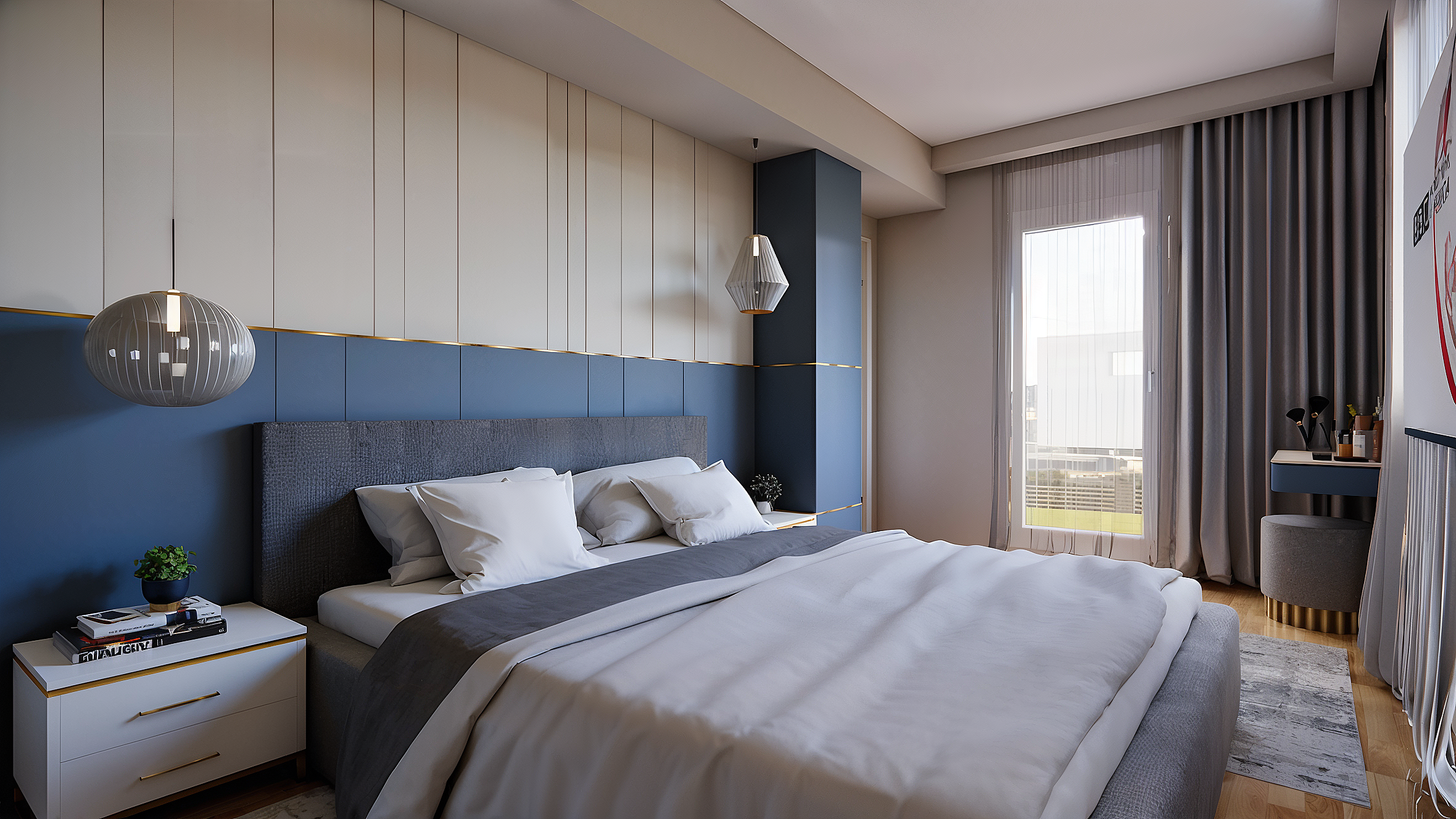 The second level is dedicated to the parents’ (master) bedroom with its own bathroom and walk-in wardrobe. Beige shades are carried over to this room as well, while the accent color is dark blue, with golden details in the form of moldings on the furniture. Wall panels are provided behind the bed with an upholstered headboard, which will further highlight this rest area. On the opposite wall is a television on elegant polyurethane wall panels. The room is full of natural light since it is oriented on both sides. In the corner, there is a cantilever dressing table that is extremely functional, although it takes up very little space. It too is in the characteristic shades of blue and gold, while a large gold-framed mirror stands out behind it.