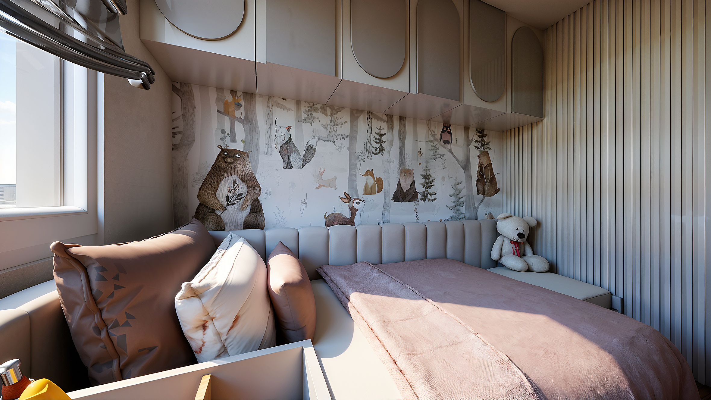 On the first level are the bedrooms – for the girl, as well as the guest room. In addition to them, a study room is also planned for parents who often work from home. A room for a girl is a space for sleeping, studying and storage. The bed is custom-made with a storage drawer, while a lounge chair is attached to it. The bed and chaise longue form a unique unit and are connected by an upholstered headboard. On the wall behind the bed is wallpaper with motifs of forest animals, in neutral colors. The desk is located under the window, and is connected to the wardrobe, functionally but also in terms of style, because these elements are permeated by a border made of MDF with grooves.