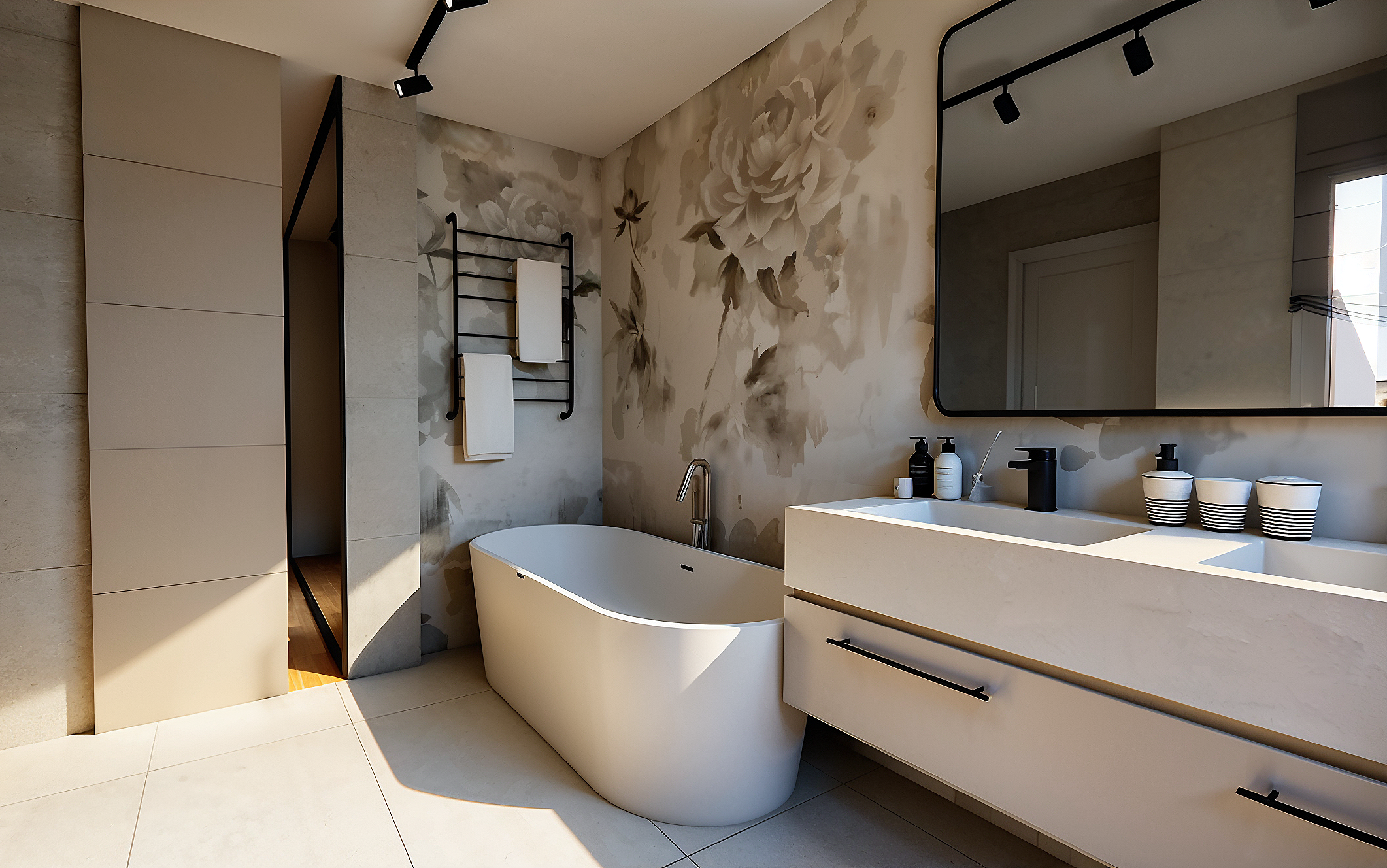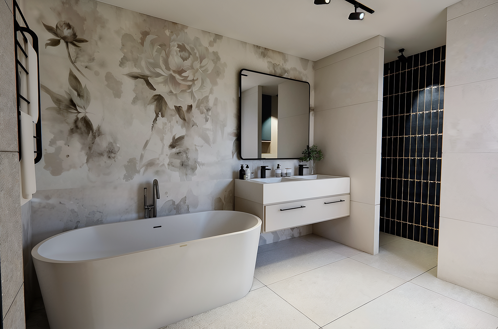 The wardrobe area is accessed from the master bathroom. As the space is small in width, the cabinets are placed only on one side, while a large mirror is provided on the opposite wall, which gives an additional illusion of width to this space. The cabinets are without fronts and with hidden lighting. The bathroom was quite challenging to design, since the investors did not like the ceramics that had already been installed when they bought the apartment, and replacing the ceramics was not possible since it significantly exceeded the allotted budget. For this reason, we designed partition walls that hid the shower and toilet, which are coated with monochrome ceramic in a beige shade. The star of this bathroom is certainly the free-standing bathtub, and its position is highlighted by the formation of a plasterboard wall over the existing ceramics, after which the wall is covered with waterproof wallpaper. Next to the bathtub, there is a space with sinks behind which there is a large mirror. The largest surface with ceramics is hidden by the mirror and wallpaper, so that it is visible only on the side wall and the floor. In this way, a completely different visual identity was given to this space without the large costs that would be required to dismantle and replace the ceramics.