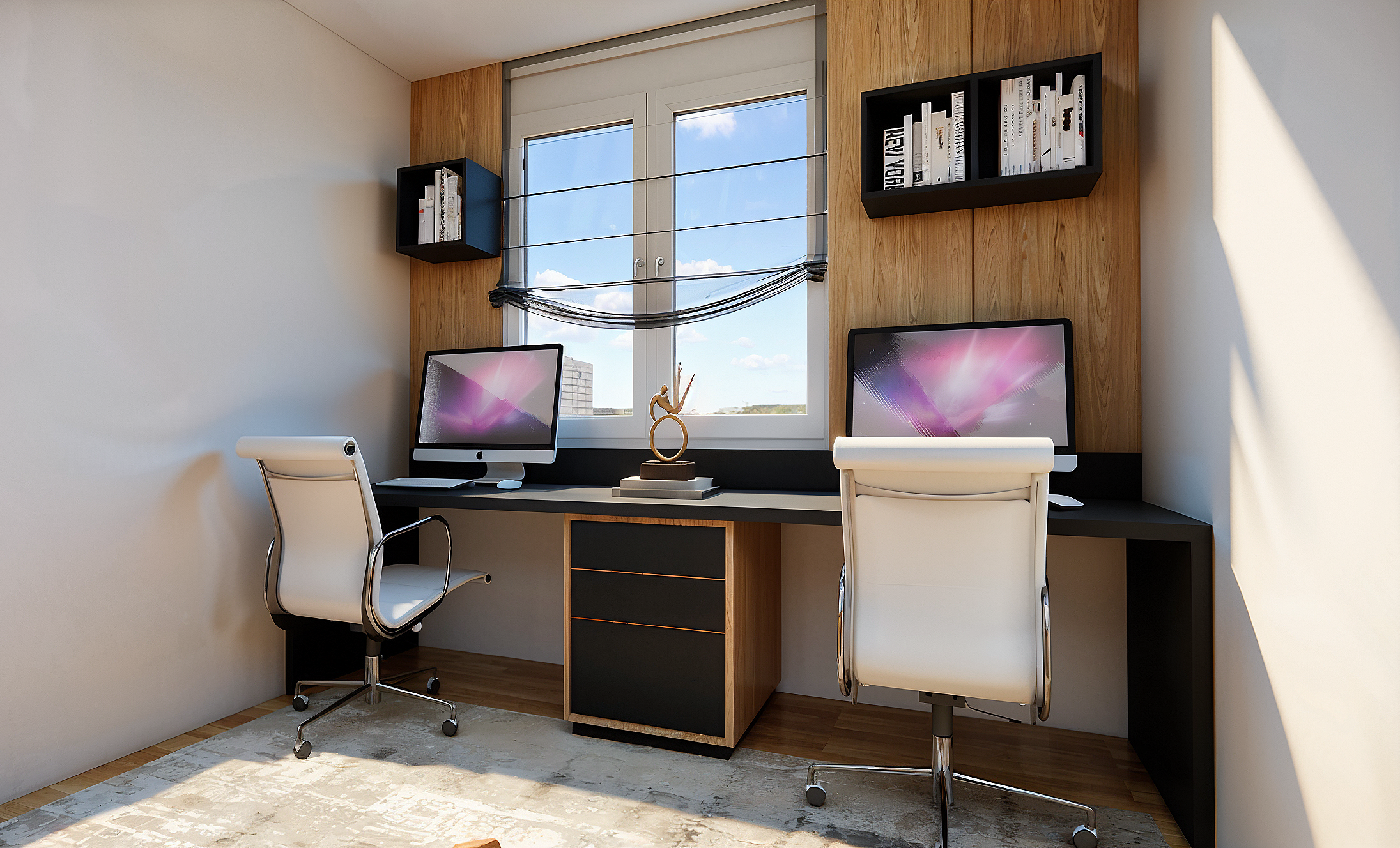The study room is intended for two people, since the owners of the apartment are entrepreneurs who often work from home. Their desks are oriented towards the window with a view of the yard. In this way, less space is occupied and the possibility of forming a corner for meeting with clients is left.