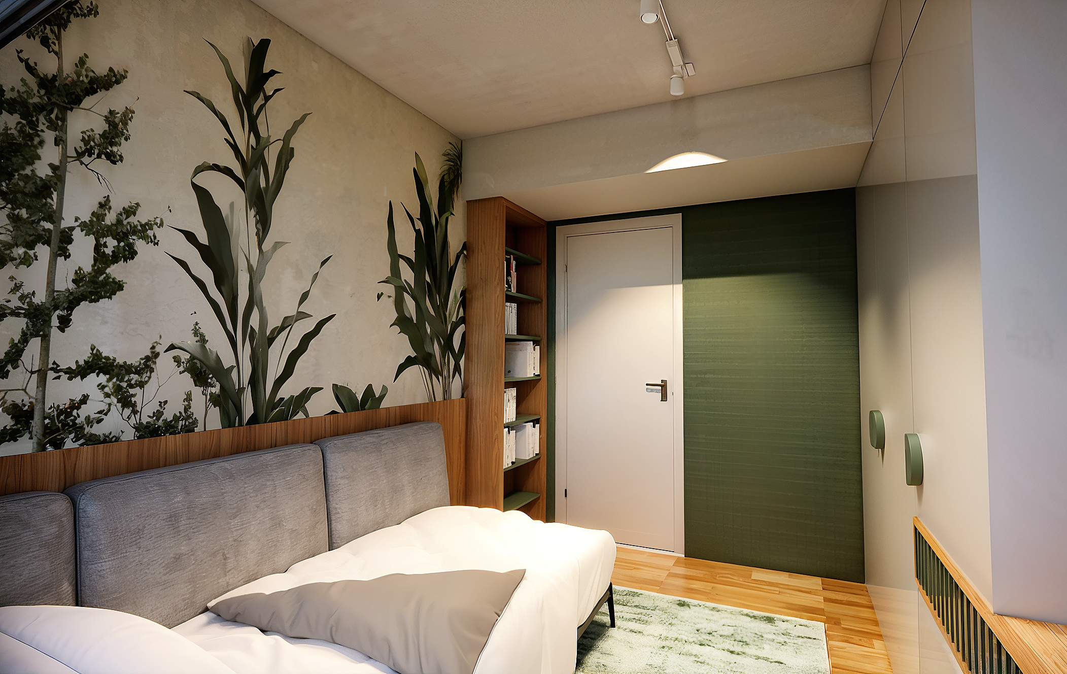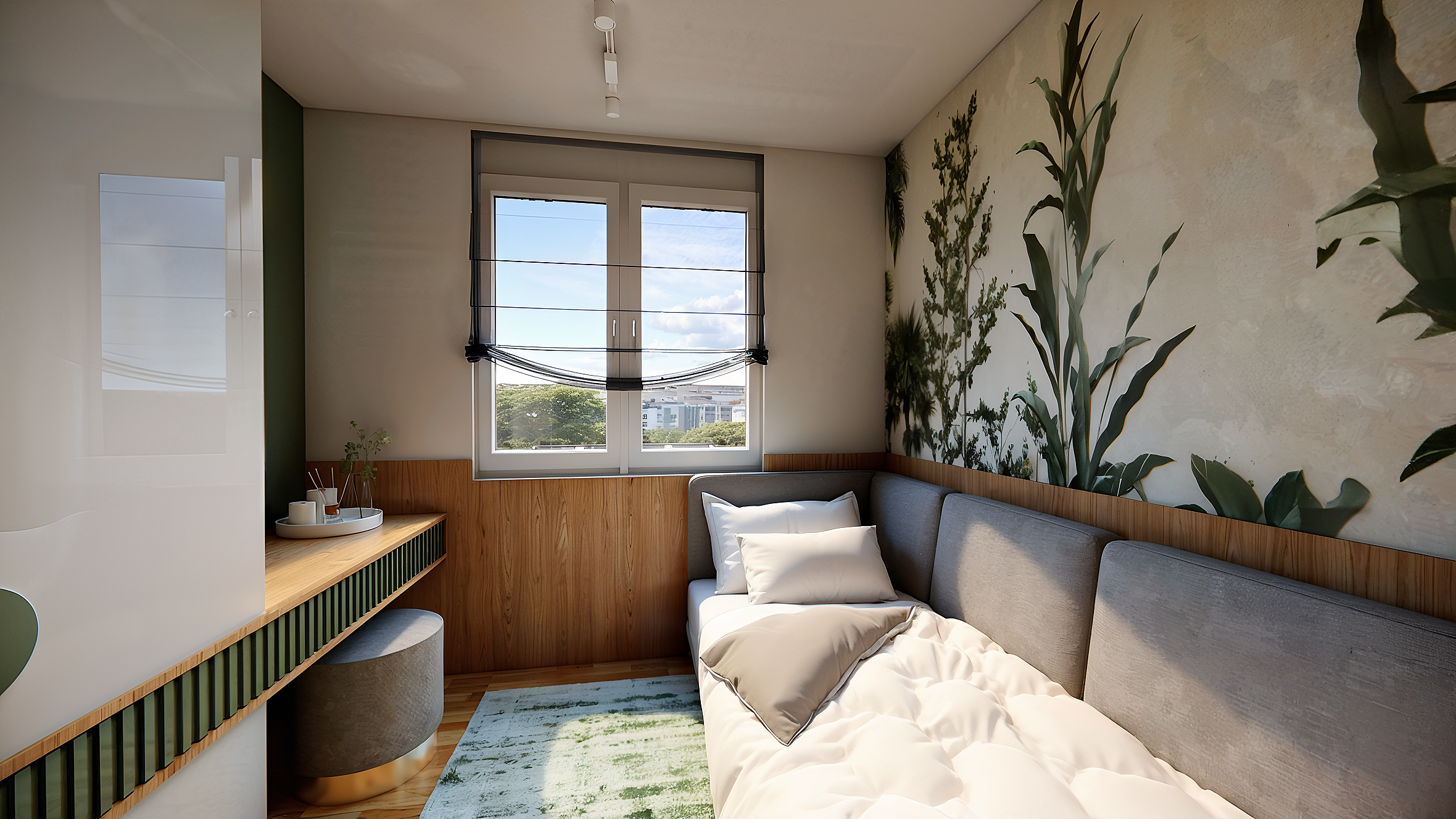 The guest room is designed to be elegant, in neutral colors, with green accents. The bed for one person is positioned in the corner, under the window. Opposite it is a cantilever dressing table with an attractive arched mirror. A wardrobe is attached to the dressing table. The space is additionally tucked away with wallpaper with floral patterns in shades of green.